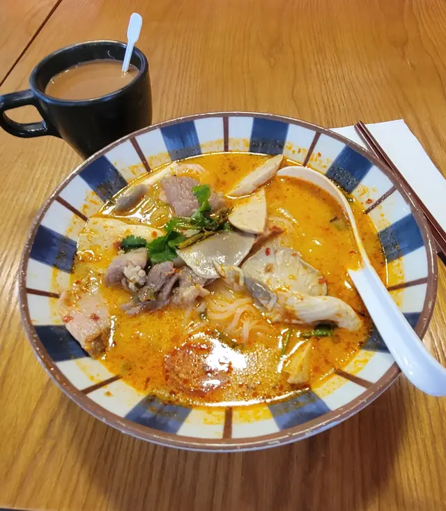 泰陰公雜錦金邊粉和熱奶茶。