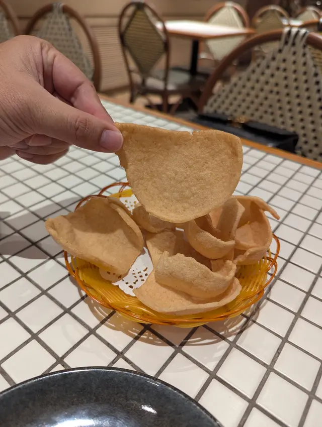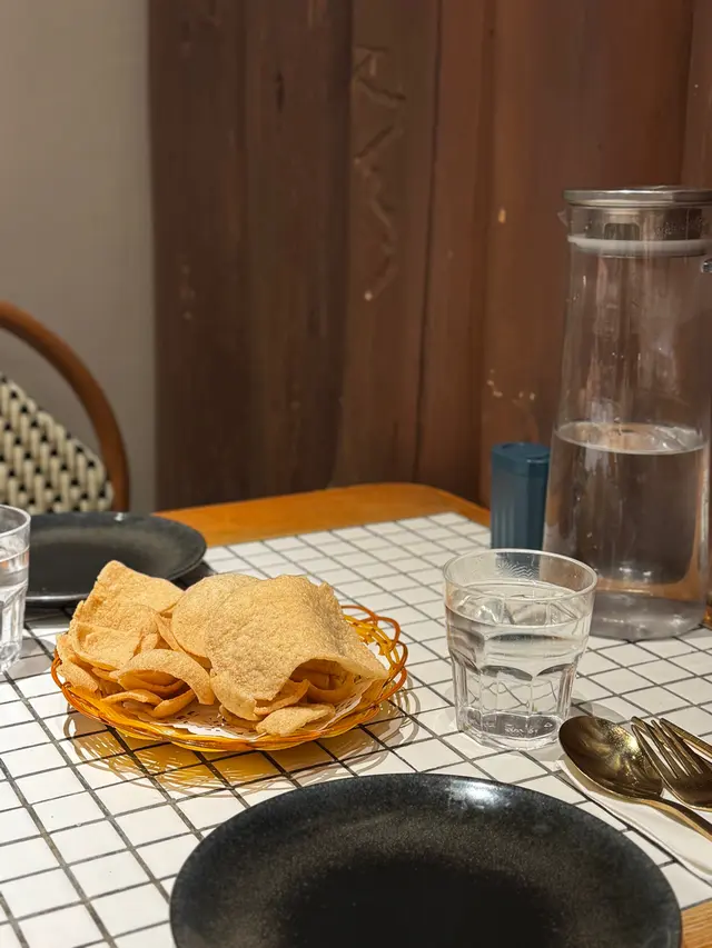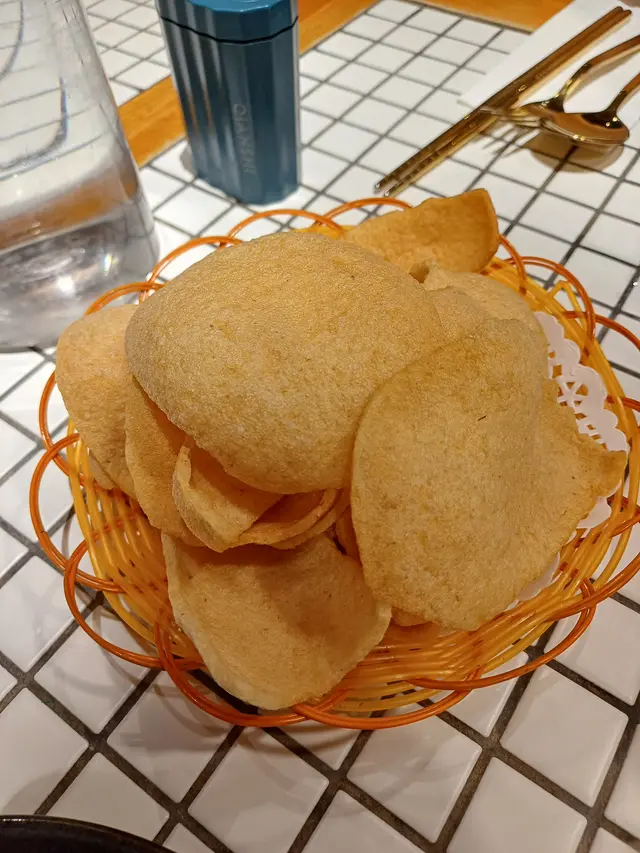 平日晚上,餐廳差不多滿座,好彩預早有訂枱。餐廳戶外地方仲可以帶寵物用餐,十分友善。我哋一入座就免費送上小食蝦片,脆卜卜,好香蝦味