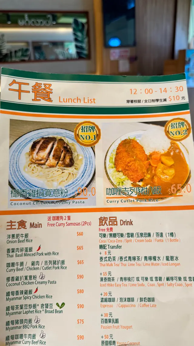 呢日同朋友一齊嚟咗呢間寫住《香港唯一緬甸特色餐廳》嘅食肆食午餐🤣以前緬甸🇲🇲首都係 Yangon 仰光 又或者叫 Rangoon,依家緬甸🇲🇲嘅新首都係 Naypyidaw နေပြည်တော် 我都想去,最想睇吓佢 20條行車線嘅Highway 🤩揀咗兩個午餐,$90「椰香雞扒寬意粉」同埋 $75「緬甸豬頸肉飯」,2個午餐嘅飲品都揀咗「無糖可樂」🤣跟餐有「咖喱角2隻」:咁我哋2個餐就有4隻,咖喱角熱辣辣脆卜卜,夠晒香口🤣「緬甸🇲🇲豬頸肉飯」:豬頸肉脂肪含量非常充足,所以好甘香🤣,仲有一小兜好惹味嘅蒜片辣椒汁可以沾豬頸肉食,要埋嚟撈飯食都得🤣「椰香雞扒寬意粉」:餐牌寫住呢個係《招牌 No. 1》,雞扒外皮煎到微焦,雞肉就好軟熟,好食🤣;寬意粉煮得少少 al dente 同埋少少甜,味道幾得意🤣另外再加咗一個 $68「蒜蓉炒芥蘭」:芥蘭菜新鮮爽脆,蒜蓉炒簡單幾好食🤣「無糖可樂」:凍冰冰嘅可口可樂就梗係好飲啦🤣查看更多