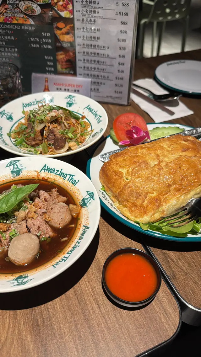 作為Poly人,都有去開紅磡同尖東食嘢,但而家先知呢度有間超抵食又好味嘅泰國菜😍 🍜 泰斗招牌牛船河 ($32)🍜 泰斗招牌豬肉河 ($32)🍜 泰斗招牌牛腩河 ($32)呢度嘅麵居然只係$32,抵到爆😍 仲可以揀船湯麵或乾撈麵,麵底可以揀河粉、金邊粉、泰國蛋麵、米粉,超多選擇! 我哋揀咗一個金邊粉撈麵、一個河粉、一個泰國蛋麵,蛋麵好粗好似一塊布咁,更有咬口🥰 麵入面除咗豬肉、牛肉塊,仲有肉丸添,而且湯底香濃,辣辣哋,好滋味🥳🦀 啖啖蟹肉奄列 ($178)我哋仲叫咗個超大件嘅奄列,切開裏面全部都係蟹肉,超足料,好誇張😍!🍢 牛奶烤豬肉($38/2串)串燒方面我哋揀咗個牛奶烤豬肉,烤出嚟超香滑,肉質更嫩更好味🤤🍛 椰香青咖哩-豬肉 ($128)🌮 烤薄餅($36)最後我哋仲叫咗個咖喱同naan食😋 青咖喱好香滑,裏面除咗豬肉,仲有茄子等蔬菜,沾滿晒成塊薄餅香脆滋味🥰 🧋泰式奶茶沙冰 ($48)🍵泰式奶綠茶($32)…查看更多