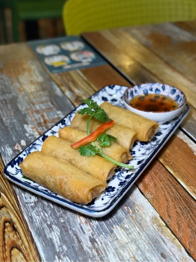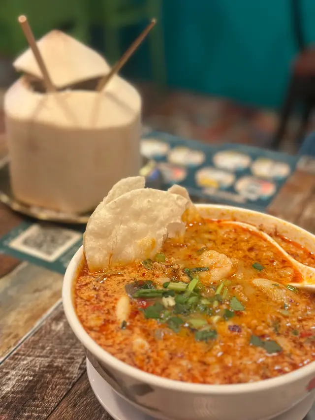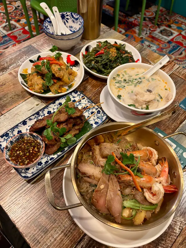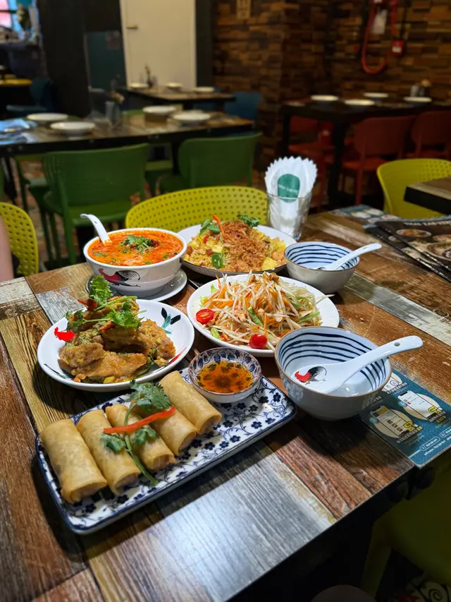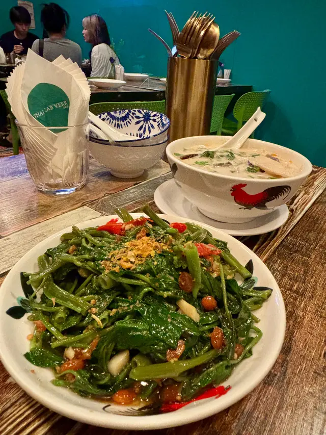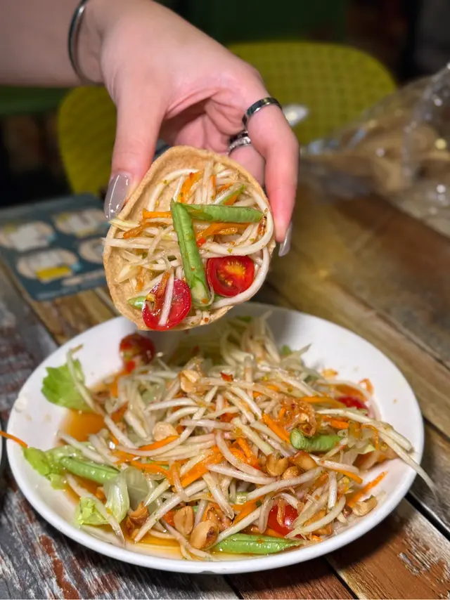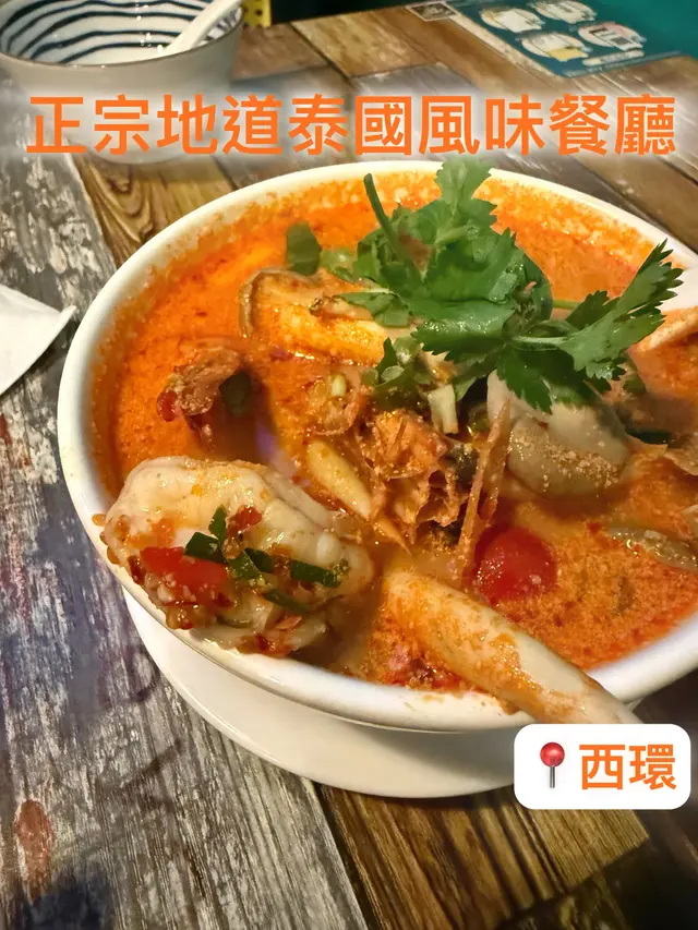 💙藍色同💚綠色都係屬於泰國每星期嘅幸運顏色~今次嚟到位於西環嘅✨泰誇張,就係以湖水綠(藍)主調的裝潢、配搭復古民族風地磚及舊廣告板裝飾,未食已經加分!打開Menu,食物款式種類都好多,價格相宜~我同朋友order咗5樣嘢share~🥗Papaya Salad 木瓜絲沙律清新的代表,擺盤精緻,份量十足,宛如一座小山,加上酸甜的調味醬,口感脆嫩😆清爽醒胃。 🌱Spring Roll (veggie) 素春卷皮薄餡多,鮮菇味最突出,搭配甜辣醬、即炸脆卜卜好好食!🍲Tom Kha Gai 椰汁雞湯超香椰汁味呀!椰漿的濃郁與檸檬草、南薑的香氣完美結合,湯底柔滑,雞肉鮮嫩多汁,加上菇菌及蕃茄仔好豐富,