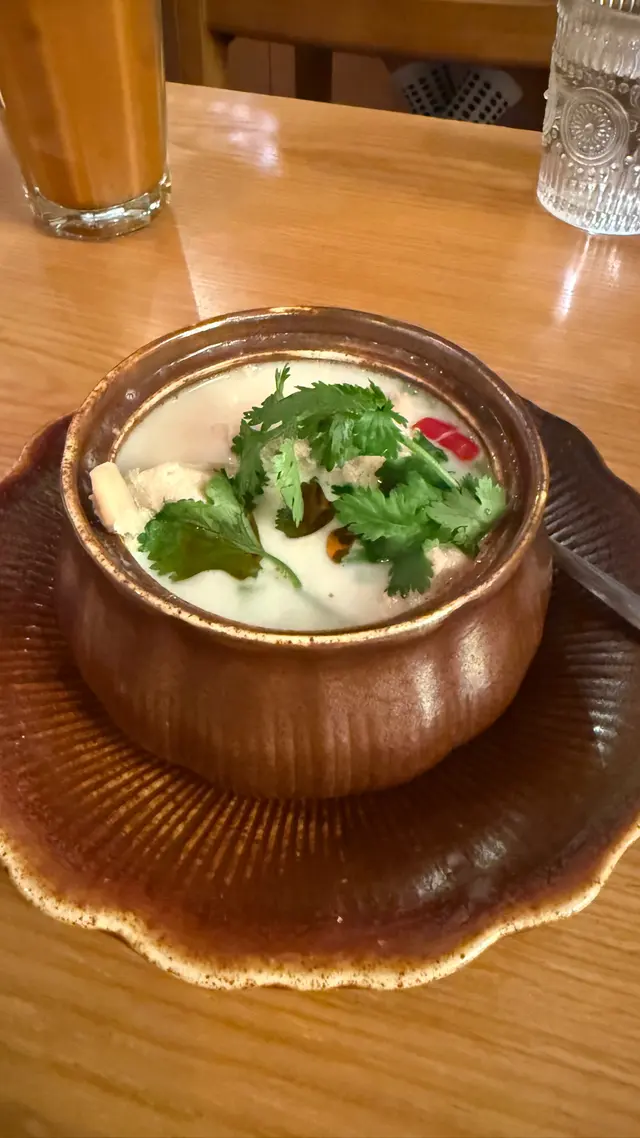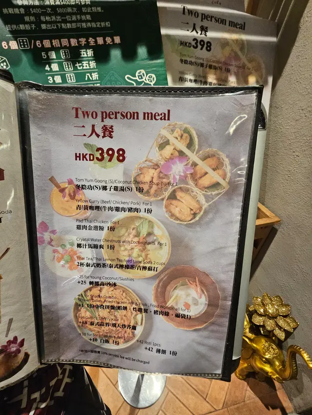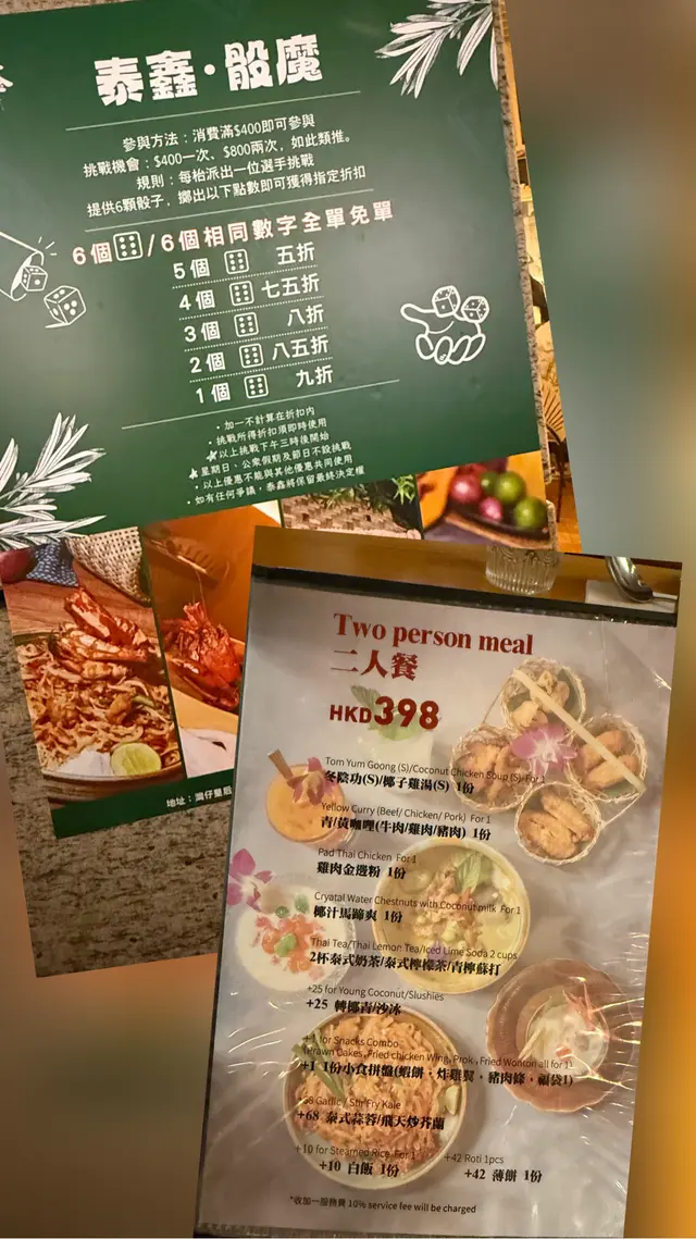 呢晚約咗幾個朋友嚟食泰菜,人多最好就係叫套餐啦,我哋一行六人叫咗個四人餐同額外嘅燒魷魚同燒牛肉,真係夠晒豐富啊😙泰式明爐酸辣魚 叫四人餐嘅話,$1就可以加配呢個酸辣魚 。有別於其他泰國餐廳,用上肉質較實淨嘅鱸魚🐟 入口唔會太肥膩,配上泰式嘅酸辣嘅醬汁非常開胃🥰 椰子雞湯椰子雞湯椰奶嘅味道好重,入面嘅雞肉都幾嫩滑😎 去埋香茅、草菇、番茄等嘅配料。除咗椰子雞湯,仲可以揀冬陰功湯㗎。泰式青木瓜沙律呢個份量相當多,青木瓜絲非常爽脆,另外調味偏辣,都係個幾開胃嘅前菜🥗黃咖喱雞咖喱項目有相當多嘅選擇,可以揀黃咖喱或者青咖喱,仲可以喺豬、牛同埋雞當中揀一款🐥 我哋揀咗黃咖喱雞,黃咖喱嘅味道唔會太辣,雞肉係啖啖肉嘅雞髀肉🍗泰式燒豬頸肉呢個燒得好乾身,入口唔會肥膩,點埋側邊嘅醬汁就更美味🐷小食拼盤造型精緻,一份有齊炸雞翼、泰式手打炸蝦餅、乾蔥蒜蓉豬肉條同埋炸雲吞福袋😙 幾鍾意佢嘅炸蝦餅同埋蒜蓉豬肉條,相當有泰國特色。泰式燒牛肉呢個係餐廳嘅招牌菜之一,勁推介多人分享必叫😎 燒牛肉呈半生熟,勁juicy又有濃郁嘅牛肉味,牛魔王最愛😻燒魷魚原條嘅燒魷魚幾爽彈🦑 特別中意佢幾厚身,食落幾有質感,仲有點少少醬汁吊翻魷魚嘅鮮味。菠蘿炒飯份量充足,炒飯炒到粒粒分明,唔會太油膩,入面有提子乾、菠蘿粒、腰果、煙肉粒等嘅配料,配埋面頭嘅肉鬆係超正🤩芒果糯米飯糯米飯煙煙韌韌,加埋芒果同椰奶真係食泰菜必備🥭飲品套餐包括泰式飲品,例如泰式奶茶同青檸梳打,更加加錢轉特飲如沙冰同椰青,椰青勁大個,入面嘅椰水都幾甜🥥 菠蘿沙冰入口幾fresh🍍臨走仲可以參加遊戲,擲中一個6就有9折,越多6折扣就越多,擲中6個一樣嘅數字更加可以免單啊🎲…查看更多