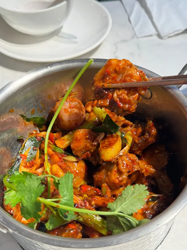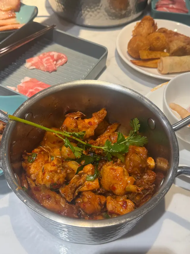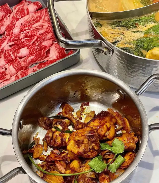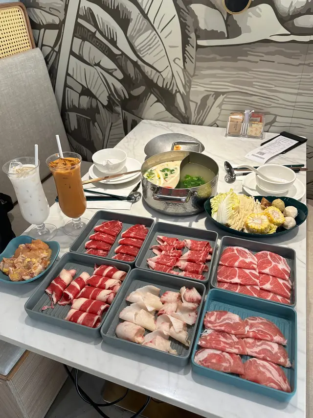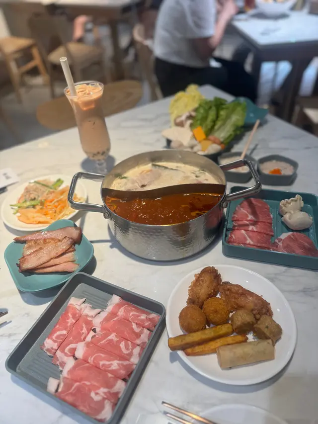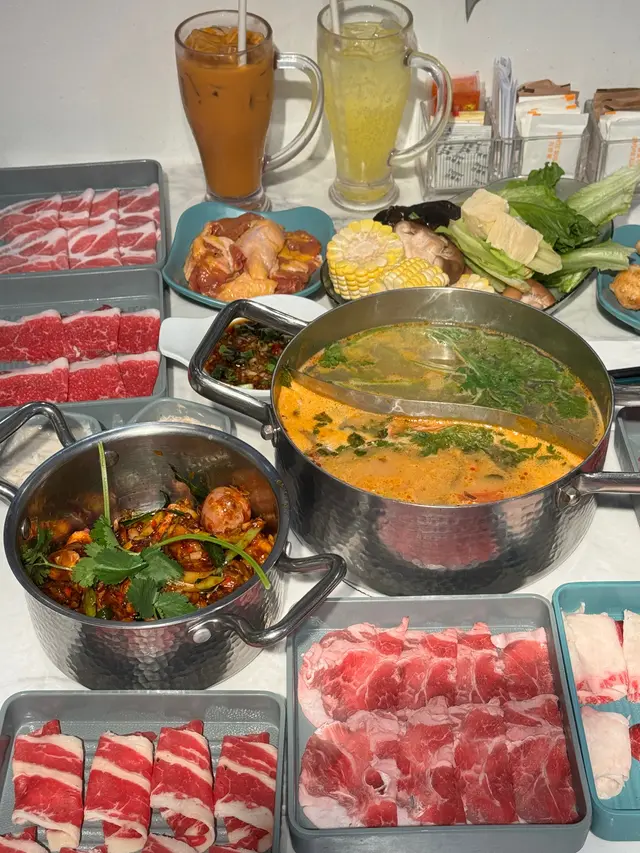 荃灣泰·初夏泰式火鍋放題必試雞煲牛板腱餐廳環境寬敞舒適,有自助區同落地玻璃窗。120分鐘放題多款肉類同配料,份量十足。6款湯底任選。蕃茄湯湯底開胃,椰汁雞湯甜香濃郁,完美鴛鴦湯底配搭。牛胸爽肉質軟嫩帶嚼勁,香氣十足;豚肉片切得薄滑,脂香滋味;卡樂Beef雪花均勻,入口細膩融化。牛板腱紋理清晰,口感彈牙肉質細嫩有嚼勁,牛味濃郁;M7牛胸腹油脂豐富,肥瘦平衡;精選羊肉卷8片薄切,肉香濃郁軟滑。雞煲:辣度適中,雞件鮮嫩入味,香氣十足令人胃口大開。 炸墨魚丸及炸魚餅外層香脆,內裡鮮甜彈牙。 飲品如蜂蜜蘆薈綠茶、菠蘿梳打清新消暑。泰·初夏地址:荃灣青山公路-荃灣段398號愉景新城2樓2030號舖 …查看更多
