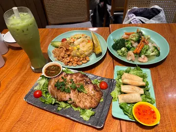 🥤飲品點了泰式茉莉奶茶$38:很大的一杯,糖度適中,不錯。🐖豬頸肉$78:是烤制的,肥瘦適中,點上泰式辣醬很好吃,多吃也不膩。🍍🍤原條泰式菠蘿海鮮炒飯$98: 食材很足、飯里已經放了菠蘿塊,還有一整條的烤菠蘿,好好吃,炒飯炒得好吃。🥦🍤西蘭花炒蝦仁$78: 食材新鮮,不錯👍😋小吃春捲$28: 不是油炸的、不油膩,出奇的好吃。整體評論:食材新鮮,味道挺好的,價格與同類店比偏實惠,性價比高,值得推薦👍