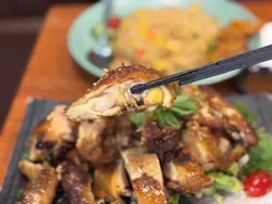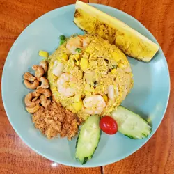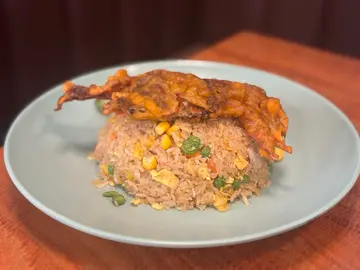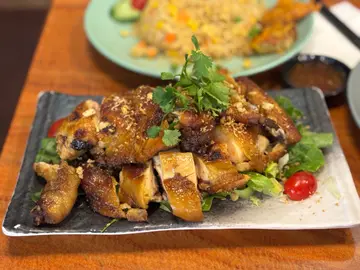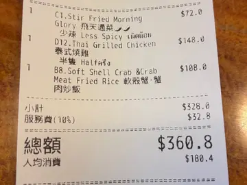 飛天通菜可以揀正常、多辣或者少辣,我地揀咗少辣所以辣度比較輕微,見到有小量辣椒,泰式豆醬嘅味道會出啲,鹹鹹香香,整碟通菜嘅份量都算大,通菜保持到翠綠爽脆,而且係新鮮熱辣炒出嚟,上到枱見到仲係出緊煙嘅!泰式燒雞可以揀半隻或者一隻,雞肉醃得入味,香茅味同香料味都好夠,充滿泰式風情,即使唔點醬就咁食都OK,而且雞肉嘅肉質都唔錯,雞髀位固然會比較滑,就算雞胸都唔會乾爭爭🍗飯麵方面揀咗軟殼蟹蟹肉炒飯,有成隻軟殼蟹放咗喺炒飯上面,炸漿唔會好厚,而炒飯都炒得夠晒乾身🍚
