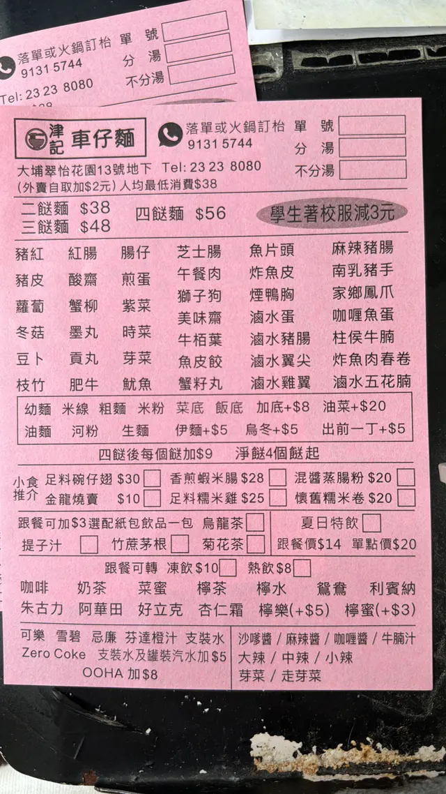 津記車仔麵 (大埔) 網址: https://s.openrice.com/QrbS0Mm4C00 地址: 香港大埔翠怡街3號翠怡花園地下13號舖 電話: +852 23238080