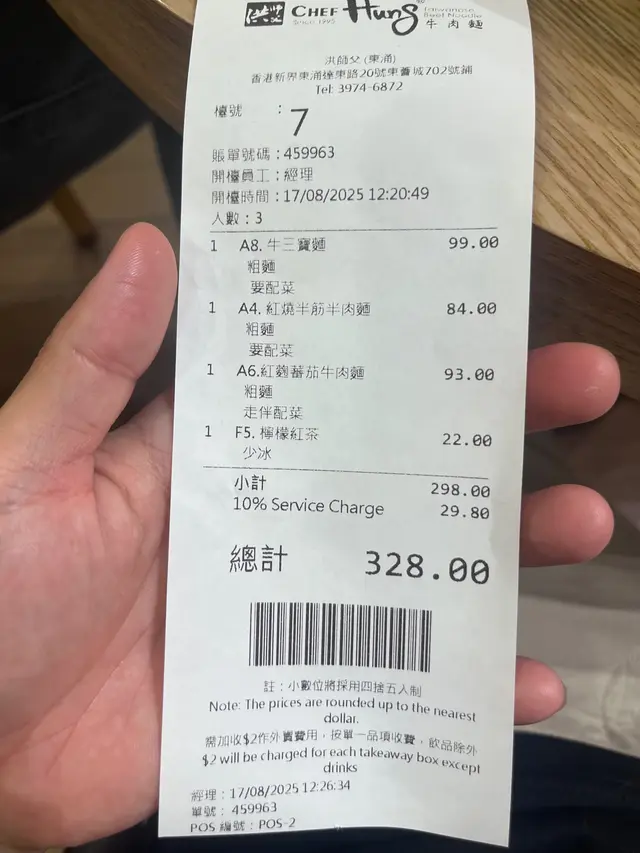 洪師父牛肉麵 (東涌) 網址: https://s.openrice.com/QrbS0MTi900 地址: 香港東涌達東路20號東薈城名店倉7樓702號舖 電話: +852 39746872