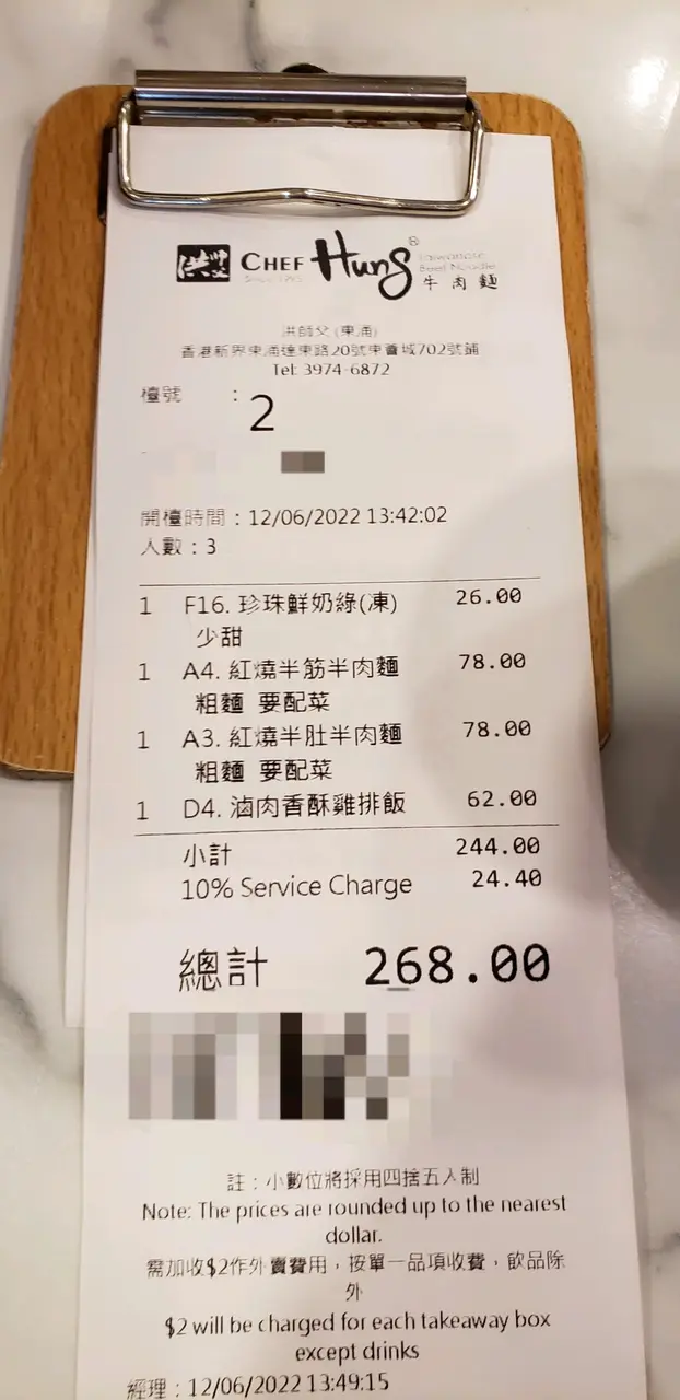 洪師父牛肉麵 (東涌) 網址: https://s.openrice.com/QrbS0MTi900 地址: 香港東涌達東路20號東薈城名店倉7樓702號舖 電話: +852 39746872