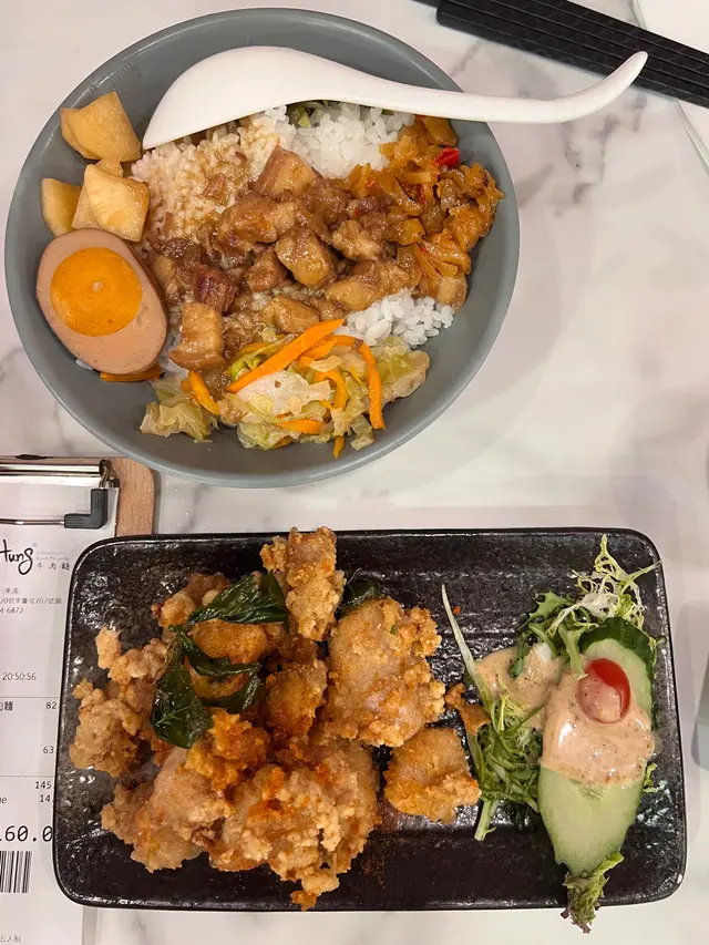 台式午市套餐 deeapril等級42024-09-14948 瀏覽 關注 裝修雅緻,光猛清潔餐牌選擇不多--- 滷肉鹽酥雞飯 --- $69套餐目測食物份量超多,非常抵食飯面佈滿台式醃酸菜,雜菜(椰菜,红蘿蔔絲),半隻鹵蛋,肉粒,菜脯,營養均衡,配搭多源化鹽酥味道中規中矩,不濃郁,外皮不夠香脆,味道走稳陣路線,肉質合格,份量勝過預期。 --- 凍珍珠奶茶--- 加$7 升级奶味不足,茶香未達標,加咗冰,味道更顯得清淡…查看更多+ 5以上食評乃用戶個人意見 , 並不代表OpenRice之觀點。讚好分享台式午市套餐 洪師父牛肉麵 https://s.openrice.com/QrbT0oQTM00檢舉 張貼 評分3味道4環境4服務4衛生5抵食用餐途徑堂食