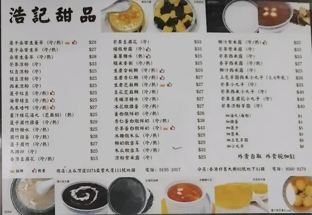 浩記甜品 (土瓜灣) 網址: https://s.openrice.com/QrbS0WyK500 地址: 香港土瓜灣土瓜灣道237A號益豐大廈地下111 & 122號舖 電話: +852 91951017
