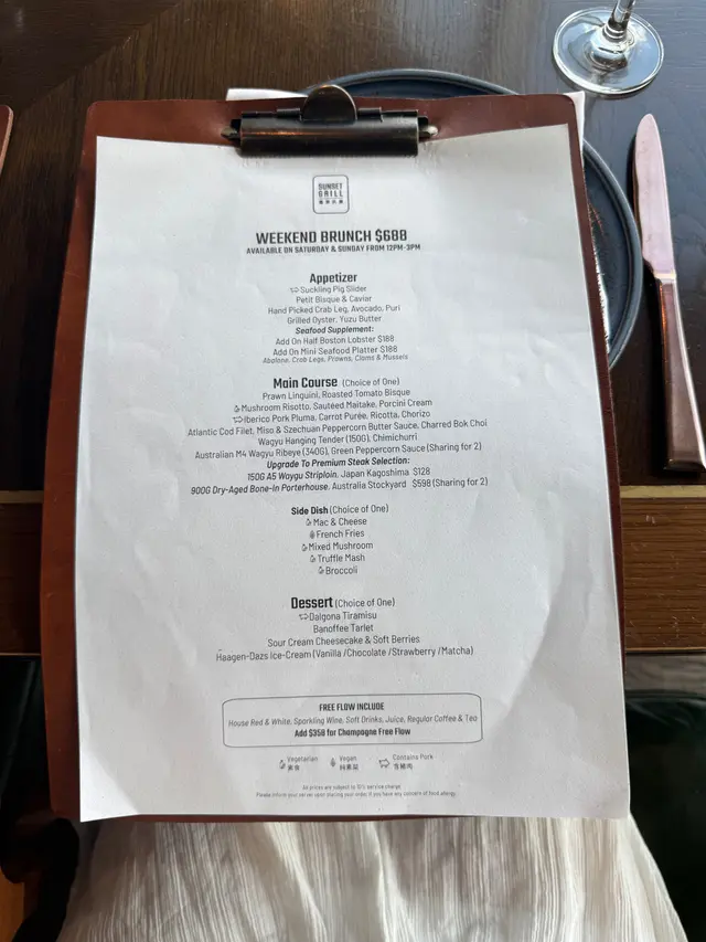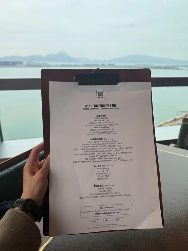 啊~!週末就是要來一個飽覽無敵大海景享受舒適休閒的Weekend Brunch ~!(。・∀・)ノ位於東涌世茂喜來登酒店的海岸扒房 Sunset Grill 的「假日早午餐」現在經eShop 預約有買一送一優惠呢!! 平均每人只需$412.8啊~!超抵~!🥹餐廳除了室內座位外 還設置露天座位呢~!𖡂 前菜◍ 生牛肉他他◍ 迷你龍蝦湯配魚子醬◍ 流心水牛芝士、醃梨子、燒無花果◍ 香煎北海道帶子配香草白甘筍蓉◍ 半隻波士頓龍蝦 (+$238)前菜以拼盤形式出場 二人份的食物擺盤美美的 ⍢每份滴滴骰骰的很可愛又很開胃! 最愛「迷你龍蝦湯配魚子醬」龍蝦湯很濃郁又很暖胃 配上魚子醬 整體更升華!「香煎北海道帶子配香草白甘筍蓉」煎得剛剛好也很不錯!另外「流心水牛芝士、醃梨子、燒無花果」 很特別~流心水牛芝士口感隱約似乳酪 配上醃梨子跟燒無花果出奇地match! 前菜還可另外加配海鮮 (生蠔/拼盤/龍蝦)波士頓龍蝦肉質鮮甜嫩滑 很不錯! (*´˘`*) 𓇠𖡂 主菜 (各選一)◍ 墨魚汁海鮮燉燴飯、烏魚子Risotto飯粒口感恰到好處 ~而且充分吸收了海鮮與墨魚汁的鮮味呢~!搭配烏魚子增添鹹香層次 個人幾喜歡~!◍ 澳洲和牛封門柳(150克)配阿根廷青醬朋友不能吃生肉的關係選了七成熟的牛扒牛肉口感比較實在 口感稍微熟了一點 不過仍然吃到一定的肉香~!配上阿根廷青醬 很特別的味道~感覺如果5成熟的話整體會很出色~!(⁎˃ᴗ˂⁎) 𓇠𖡂 配菜 (各選一)◍ 薯條◍ 黑松露薯蓉配菜的「黑松露薯蓉」巨好吃!每一口綿滑的薯蓉都帶有非常濃郁的黑松露香!𓇠𖡂 甜品 (各選一)◍ 香蕉拖肥撻◍ 忌廉芝士蛋糕配雜莓Unexpected的「香蕉拖肥撻」很有驚喜!•͈౿•͈脆脆的撻底上放著一層香蕉蓉 撻面再放滿忌廉層次口感很豐富!沾上碟上的拖肥醬 味道甜而不膩 更豐富!「忌廉芝士蛋糕配雜莓」 芝士味濃郁 質地輕盈配上雜莓的果酸 簡簡單單的幸福~!𓇠𖡂 飲品(free flow)飲品任飲包括精選紅白酒、氣泡酒、汽水、果汁、咖啡及茶…查看更多