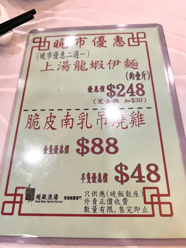 剛好朋友生日, 朋友最愛吃中菜 , 所以帶他去海洋超級漁港晚餐, 中菜館推出晚市套餐,十分抵食, 仲有指定的晚市優惠 , 加上環境舒適 ,交通方便, 與朋友聚餐一個好地方。晚市四人套餐 $788高湯白灼基圍蝦新鮮大隻的基圍蝦,用高湯輕輕灼熟, 可以保留了海鮮的原汁原味,搭配一點醬油, 入口鮮甜彈牙 , 簡單而滋味。錦繡燒味拼盤燒味拼盤有我最喜歡的豉油雞、 燒鴨及叉燒,十分豐富,燒鴨很香脆 、叉燒及豉油雞, 滿滿甜甜的醬油味道,讓人一口接一口。碧綠油泡巨型龍躉球油泡後的巨型龍躉球,外脆內嫩,香氣四溢, 鮮嫩滑溜 ,配搭色彩鮮豔紅、黃椒,口感好清爽。東林扒上素菜色彩繽紛的素菜, 擺盤精緻 , 冬瓜軟嫩, 雲耳爽脆, 西蘭花清脆,搭配薄薄的芡汁提味 ,健康又美味。紅酒燴牛尾煲牛尾經過長時間燉煮,肉質軟嫩入味,吸收了紅酒的濃郁酒香, 色香味俱全, 拌飯一流。流沙包外皮鬆軟, 大口咬下, 緩緩流出金黃的鹹蛋黃餡料, 香甜滑溜,令人驚喜。紅豆椰汁糕入口冰冰涼涼 , QQ彈彈, 啖啖紅豆及椰汁的甜香, 甜而不膩。粉葛豬展老火靚湯老火湯火喉十足,湯頭清潤鮮甜,加上軟腍豬展,清香粉葛, 湯料豐富 ,清熱消暑。炸子雞半隻/晚飯優惠價 $48剛剛炸起的炸子雞 , 香氣四溢, 外皮金黃酥脆,肉質鮮嫩, 沾上特製南乳醬油, 更加惹味 。…查看更多