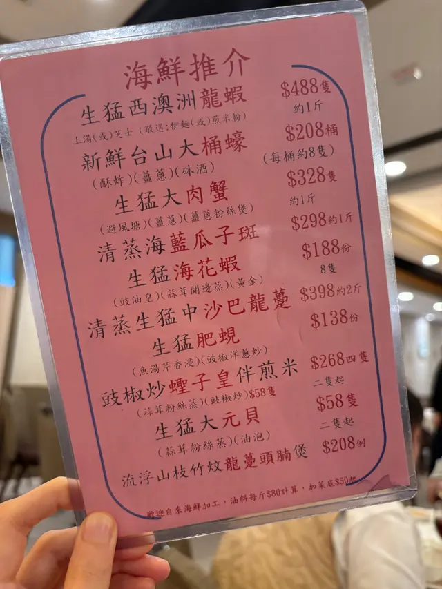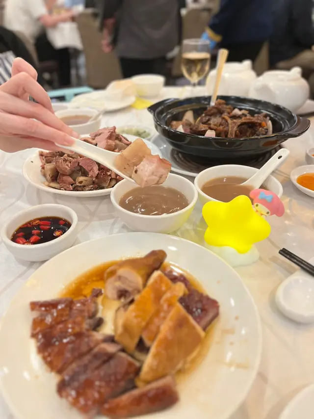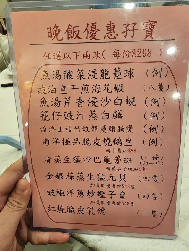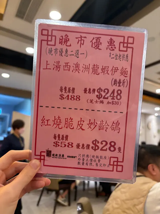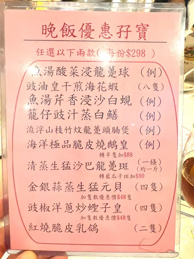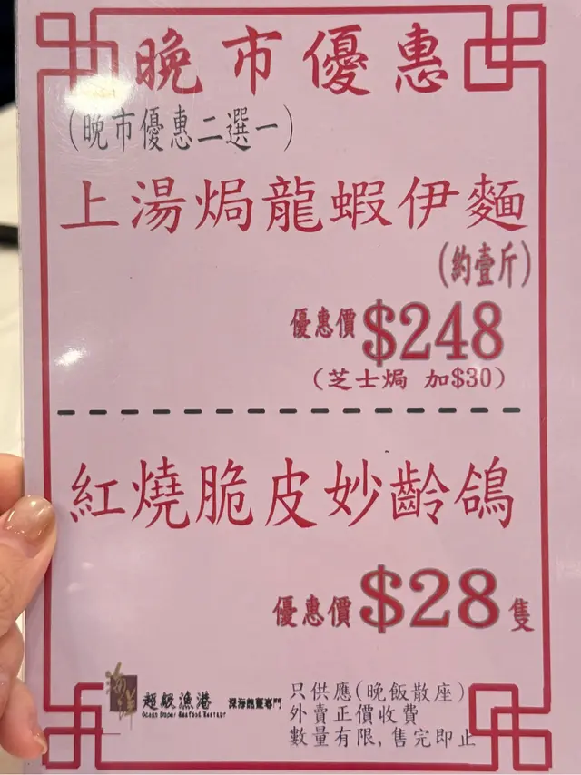 剛好朋友生日, 朋友最愛吃中菜 , 所以帶他去海洋超級漁港晚餐, 中菜館推出晚市套餐,十分抵食, 仲有指定的晚市優惠 , 加上環境舒適 ,交通方便, 與朋友聚餐一個好地方。晚市四人套餐 $788高湯白灼基圍蝦新鮮大隻的基圍蝦,用高湯輕輕灼熟, 可以保留了海鮮的原汁原味,搭配一點醬油, 入口鮮甜彈牙 , 簡單而滋味。錦繡燒味拼盤燒味拼盤有我最喜歡的豉油雞、 燒鴨及叉燒,十分豐富,燒鴨很香脆 、叉燒及豉油雞, 滿滿甜甜的醬油味道,讓人一口接一口。碧綠油泡巨型龍躉球油泡後的巨型龍躉球,外脆內嫩,香氣四溢, 鮮嫩滑溜 ,配搭色彩鮮豔紅、黃椒,口感好清爽。東林扒上素菜色彩繽紛的素菜, 擺盤精緻 , 冬瓜軟嫩, 雲耳爽脆, 西蘭花清脆,搭配薄薄的芡汁提味 ,健康又美味。紅酒燴牛尾煲牛尾經過長時間燉煮,肉質軟嫩入味,吸收了紅酒的濃郁酒香, 色香味俱全, 拌飯一流。流沙包外皮鬆軟, 大口咬下, 緩緩流出金黃的鹹蛋黃餡料, 香甜滑溜,令人驚喜。紅豆椰汁糕入口冰冰涼涼 , QQ彈彈, 啖啖紅豆及椰汁的甜香, 甜而不膩。粉葛豬展老火靚湯老火湯火喉十足,湯頭清潤鮮甜,加上軟腍豬展,清香粉葛, 湯料豐富 ,清熱消暑。炸子雞半隻/晚飯優惠價 $48剛剛炸起的炸子雞 , 香氣四溢, 外皮金黃酥脆,肉質鮮嫩, 沾上特製南乳醬油, 更加惹味 。…查看更多