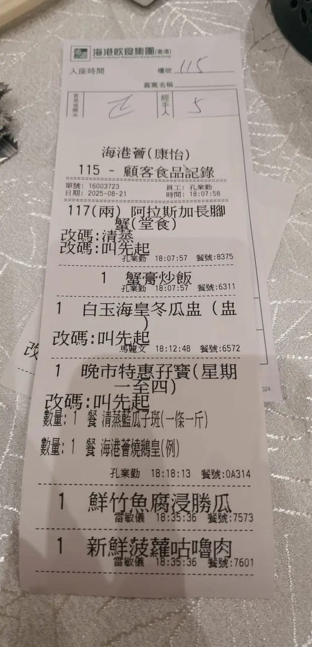 因為,方便同事放工趕來聚會,於是,放棄灣仔分店,揀選呢間分店怎料….去到人山人海,枱與枱之間十分狹窄,背貼背,四周都有擺放輪椅。心諗個市好番嗱,人人出來食飯消費!後來,知悉原來是長者團體聚餐會!經侍應催促去揀蟹,因怕稍後人多要輪候,匆匆忙忙之下,揀選一隻7.3斤的大蟹@$298一斤(全個魚缸最大啲),我哋有6個人,可以盡情享受!半個鐘左右,蟹擺上枱,外觀頗正常,size 龐大,剪開分享時,水汪汪的,肉質非常林,撕開蟹殼,肉係一塊塊狀,沒有一絲絲的,冇鮮甜味,而且,帶酸味! 氣憤!點叫冬瓜盅,成個鐘頭都未上枱,多番催促,原來,張單搞亂咗,上枱時冇個冬瓜,只用湯碗裝 - 冬瓜湯,湯只有小量冬瓜….. 唉!其他小菜,味道普通!下次,不會嚟!貼錢買難受!分店水準很大差距!…查看更多