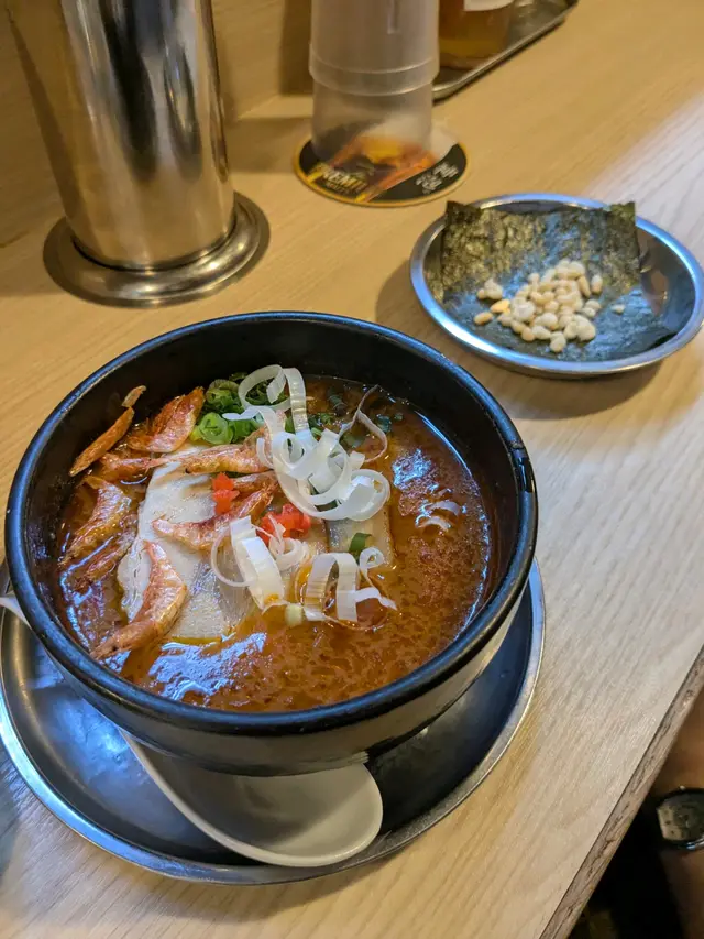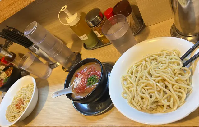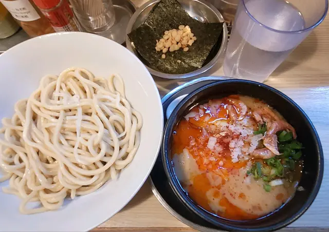 今日3號風球又唔想留喺屋企,唯有出去試吓海老名的沾麵(想試咗好耐)。去到長沙灣其實都有啲難搵,因為門牌比較簡潔。但皇天不負有心人終於搵到😅我地未開門入去,個店員已經衝出嚟招呼我哋入去坐🤭入面好有日本feel,播著日本歌曲,座位亦只有數個。一坐下店員即為我們介紹,並說蠔麵已經賣完了因一天只有五碗。於是我們點了兩客沾麵(蝦汁味噌沾麵和蝦汁醬油沾麵),看著店員在前方煮麵的時候好似好似置身於日本。當蝦麵汁送上時賣相相當美觀和吸引,其次就是一碟的沾麵。店員告訴我們吃之前要把麵汁先攪勻,又或者可以加少許蝦油醋提鮮,試了兩啖湯汁好味而不鹹!第一啖吃入口時... 嘩不得了!面質煙煙韌韌再配合蝦汁味噌真的很好吃哦!叉燒用火炙過夠野味又香口,蛋仍是流心好吃👍但係最特別的是櫻花蝦,我覺得這裡的櫻花蝦和外出吃到的是有點不一樣,這裏的櫻花蝦口感好飽滿紮實(不是薄薄的那種)。而當你吃完整碗沾麵的時候,店員會加幫你加熱湯,當湯飲又是另一種嘅享受和層次(我們連湯都喝光)。😂😬🫡下次必定提早去試它們的蠔麵!😁🥂🤟…查看更多