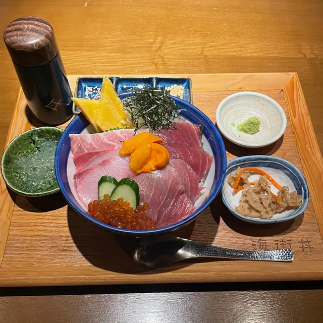 鐘意揸車嘅人又鐘意睇戲,一定會去EMAX,但去開呢度睇戲就知,呢度無乜嘢食,除左以前最愛嘅蕃滿門外,就最想食呢間海街丼。有一排丼飯成行成市,中環的海言當然係重點,但海街丼一直都係食丼飯嘅代表作,久不久去下,都唔係太差。成年無黎過,就叫過最貴嘅丼飯,加少少前菜,咁就一餐,簡單食下快去睇戲,不用十分鐘就完成。廚司推薦丼,有呑拿赤身,拖羅,金目鯛,海膽,玉子,深海池魚,仲有三文魚籽,應該係勁令人滿意嘅一個選擇 ,似足築地感覺,二百幾平過中環價錢好多。特別愛赤身,而海膽太少,赤身同池魚又係好新鮮,最特別係呢到嘅飯,要自己加啫喱醋,太耐無黎,唔記得呢個食法,都幾得人驚,鐘唔鐘意見人見致,個人覺得幾得意。不過最好係佢有好多飯,原因係後面有個魚湯可做泡飯,仲有好多配菜整個泡飯,好此道者必愛。另外前菜凍辣蕃茄同醬油菠菜都好唔錯,開胃而味道有特色,大碟而且幾好打卡,多人就一定要點多幾個點心試試。行過黎睇戲都應該要試下,絕對會係大部人嘅飯堂。查看更多