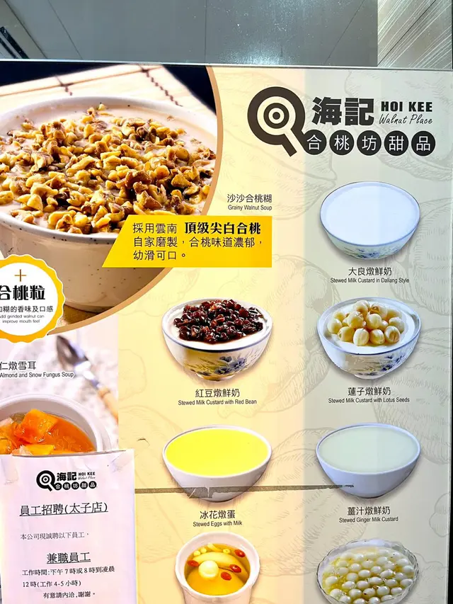 合桃糊和芋圓也很出色 wai3aa3等級42021-09-0897 瀏覽 關注 吃完Light Dinner後,時間尚早,肚皮還有空位,就立刻想去海記吃個甜品,勝在選擇多,價錢又合理,每一款都是心得誠意之作。而且太子有2間分店,一間滿座,多走1分鐘就可以去另一間分店碰碰運氣。補腎合桃糊 + 芋圓 $26 + $10合桃糊是這裡的招牌菜,眼見其他客人多叫沙沙合桃糊,即合桃糊再加合桃碎,我就對芋圓更有興趣。加$10有一碗超過20粒芋圓、紫薯圓和地瓜圓,粒粒大小一致,煙靭有口感,而且吃得出芋頭、紫薯和蕃薯的原味道,絕不只有粉味。主角合桃糊味道濃郁,幼滑可口,不愧是自家磨製,沒有坊間合桃糊的水感,也沒有合桃澀味,甜度亦適中,這個組合非常高質和完美。芋圓喳咋 $34所有豆類、芋頭、西米都煮得軟綿,富椰奶香,甜度適中,連同芋圓、紫薯圓和地瓜圓,材料豐富,份量足,是有飽足感的一碗糖水。…查看更多以上食評乃用戶個人意見 , 並不代表OpenRice之觀點。讚好分享合桃糊和芋圓也很出色 海記合桃坊甜品 https://s.openrice.com/QrbT0cLOzW0檢舉 張貼 評分4味道4環境4服務4衛生4抵食用餐途徑堂食