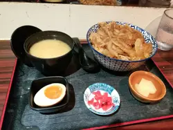 今日來到有點名氣的龍亭,果然人流不絕,好在早到,不用等位。是日倆口子晚餐如下。豚肉生薑燒定食: 配以半生熟蛋半隻、味噌湯、薑片及兩片菠蘿。味噌湯內有蜆內,略嫌咸了一點。豚肉及生薑是燒烤後才放上飯面,十分惹味