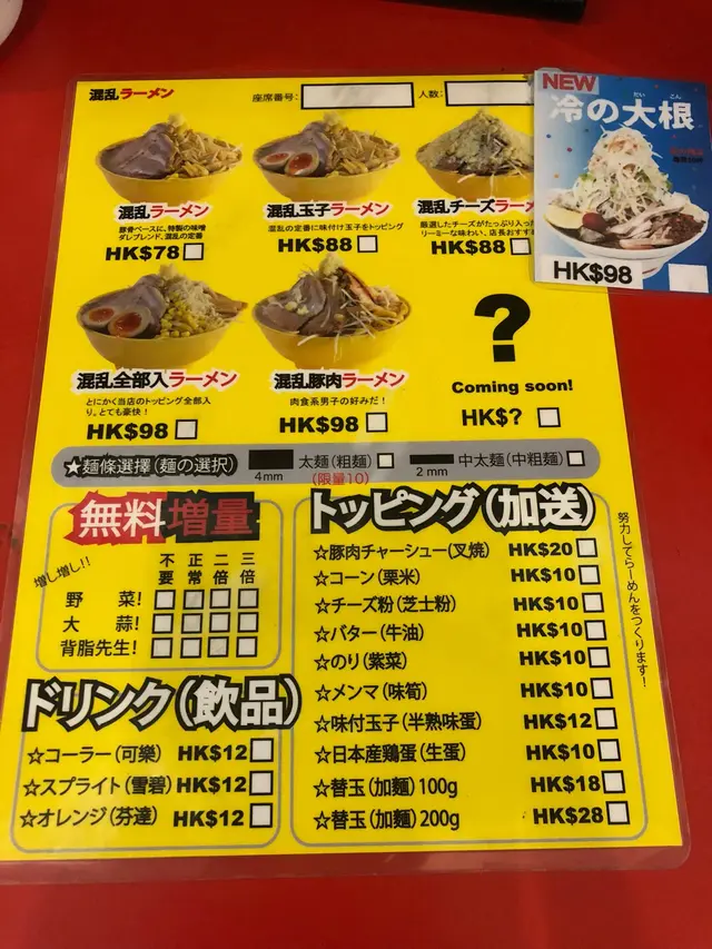 混亂拉麵 (深水埗) 網址: https://s.openrice.com/QrbS0C7a200 地址: 香港深水埗欽州街52至54號平安大廈地下B號舖 電話: +852 28118606