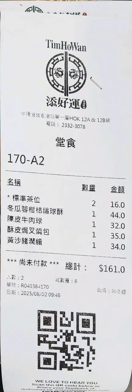 20250802 週六早上約左朋友在中環食早餐,位置都難搵,朋友曾經來過都搵唔到,要到禮賓部詢問。裝修簡潔,在中環當然唔會寬敞,但我也覺可以,價格尚可,茶為八元1位,點心一般30-50元,點心都是落單即蒸的,賣相好,引起食慾。服務員細心有禮,辣椒油夠香辣不錯。黃沙豬潤腸,在外邊比較少有,腸粉皮夠滑稍厚,豬潤就覺得不錯。酥皮焗叉燒包,酥皮正,叉燒餡味不太鹹,亦唔會好多汁,我覺得幾好。陳皮牛肉球,一般啦,其中一粒朋友食落覺得唔太熟驚就沒有食,結單時已向店員反映。冬瓜蓉金桔繡球酥,唔太甜,酥皮有點兒實。…查看更多