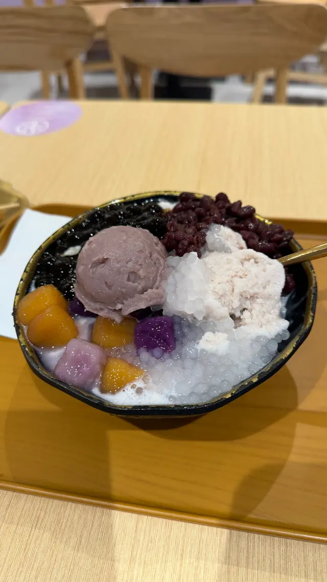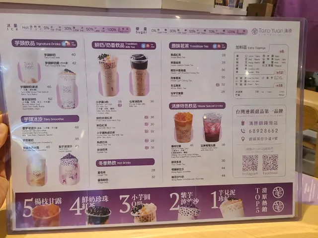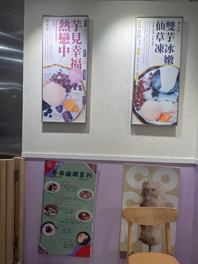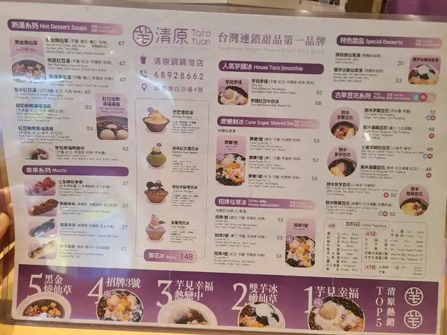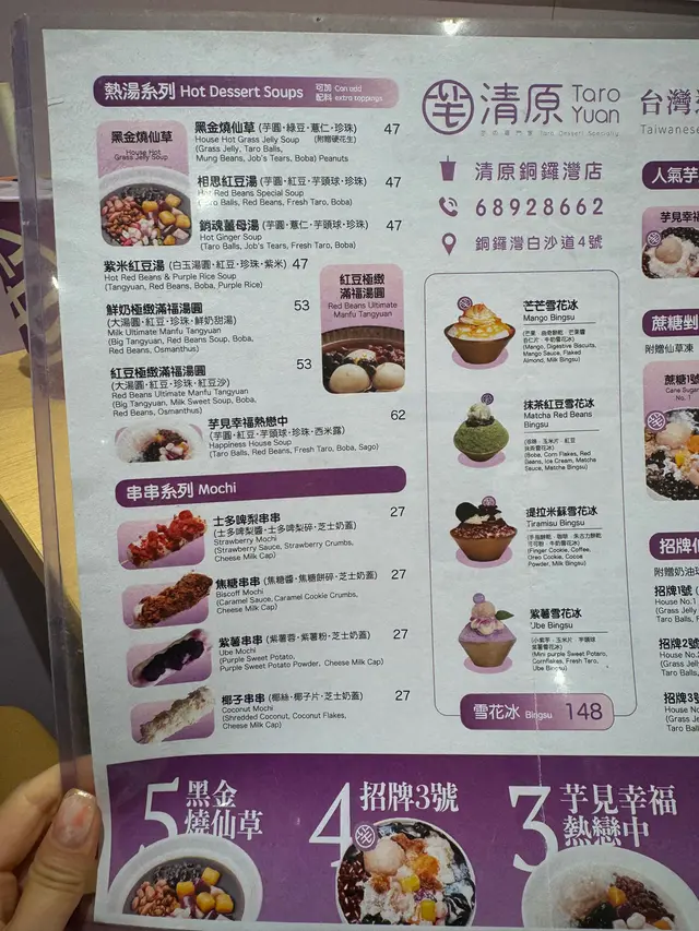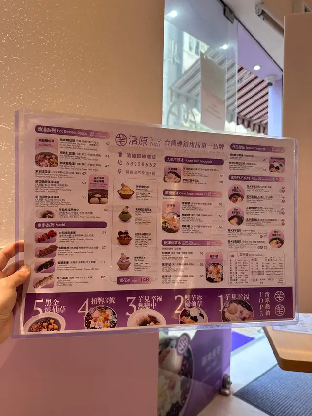餐廳:清原地點:銅鑼灣白沙道菜式:芋頭甜品餐牌:人氣芋頭冰、蔗糖剉冰、招牌仙草冰、雪花冰、特色甜品、熱湯系列、串串系列,古早豆花系列,芋頭飲品、芋頭冰沙、鮮奶飲品、奶香飲品、特色飲品、茶、冬季熱飲等等。好多食品飲品都改左個特別既名。芋見幸福熱戀中 $62呢款芋見幸福熱戀中係熱湯系列,材料有紅豆,多色芋圓,芋頭球,煙韌珍珠同西米露。個甜湯滑溜少甜,材料豐富,味道口感都唔錯,熱食我覺得更好味。芋見幸福 $62芋見幸福係人氣芋頭冰之一,基本上就係芋見幸福熱戀中凍上,可以見到材料超級豐富,多到滿瀉咁滯。大量滑溜芋頭冰配有紅豆,芋頭球,多色芋圓,珍珠同西米,款款材料同芋頭冰都好夾,味道唔會太甜,解暑解渴一流。如假包換,食嗮見到碗底。芋見泥珍好 $62芋見泥珍好好大杯。飲落味道微甜,食落有超多煙韌珍珠同小芋圓,帶有紅豆同西米露,好有口感,層次豐富。今餐所有甜品飲品都好味道,好有特色,而且唔會太甜。餐廳裝修唔錯,乾淨企理。店外係一片淺紫色,好易認。…查看更多