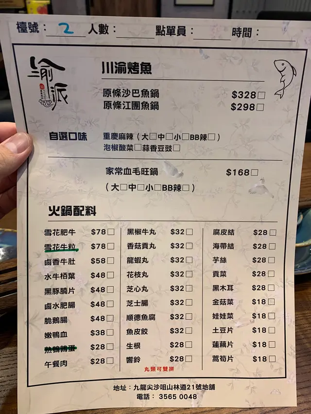 渝派燒烤烤魚 (尖沙咀) 網址: https://s.openrice.com/QrbS0cHKB00 地址: 香港尖沙咀山林道21號地下 電話: +852 35650048