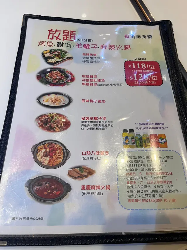 為食🐑近期食過性價比最高(沒有之一)嘅任食雞煲火鍋❗️放題(90分鐘)!🐟烤魚•雞煲·羊蠍子·麻辣火鍋💰每位$118❗️(6點前離座) / $128❗️(6點後 / 2位起)先揀一個煲,為食🐑當然揀麻辣雞煲啦🔥🐔!雖然價錢好平,但味道一啲都唔馬虎~麻辣兼備,香濃惹味,雞肉都唔會太嚡,仲幾嫩滑㗎!最正係勁多火鍋配料任你揀,包括牛肉、豬肉、魷魚、各式丸類、蔬菜等等,真係應有盡有!仲有汽水、前菜、飲品全部任飲任食,真係超抵!令我最印象深刻嘅係:❤️韭菜豬紅 — 麻辣香口!💚炒油麥菜 — 鑊氣十足,味道濃郁!🍮甜品方面仲有中式糖水添,真係由頭滿足到尾!呢個價錢,絕對係我食過最抵食嘅雞煲任食!🤎滷水鵝肉 $98原來呢度除咗雞煲之外,亦都好出名做潮州菜式!所以叫咗個滷水鵝試吓~味道香醇濃郁,肉質滑嫩唔韌,滷得夠晒入味,質素竟然有驚喜!本身都好想試埋蠔仔粥,不過實在太飽啦,下次一定要再嚟試!✨呢個價錢食到咁多嘢,全部嘢都OK唔難食,有幾款味道仲幾好添!如果你要求唔高,但又想大滿足,一定好似我哋咁食得咁開心!σ`∀´)σ…查看更多