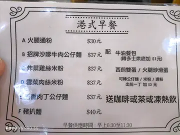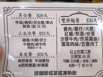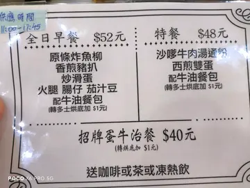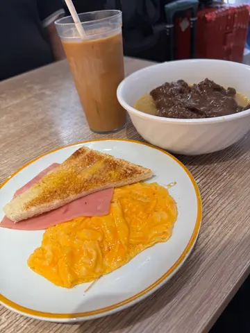 呢間茶餐廳嘅是日午餐幾得意㗎.每日餐牌都係手寫嘅.是日午餐唔啱食嘅話, 呢度炒粉麵嘅選項都幾多, 總有一款啱你心水!沙嗲牛肉出前一丁配西多士 (HK$55)呢個配搭真係邪惡到爆!個份量亦都大到嚇親我.同事話呢度嘅沙嗲牛肉麵係好好食, 一啲都冇講錯.湯底好濃郁, 沙嗲味勁香.仲有粒粒花生嘅口感.牛肉份量勁多.佢仲要唔係配普通公仔麵係配出前一丁.真係超正!件西多士炸到金黃色.以為西多士係配角, 個份量會細啲啦.錯晒啊!成件西多士係正常方包咁大, 仲要勁厚身.楓糖漿你想落幾多都得啊!裡面嘅花生醬餡都幾多.而且食落係外脆內軟.都係勁好食!整體嚟講, 呢間餐廳嘅沙嗲牛肉麵同西多士真係勁好食.HK$55 包埋例湯同飲品, 凍飲都唔使加錢, 真係勁抵.個例湯仲要好好飲.…查看更多