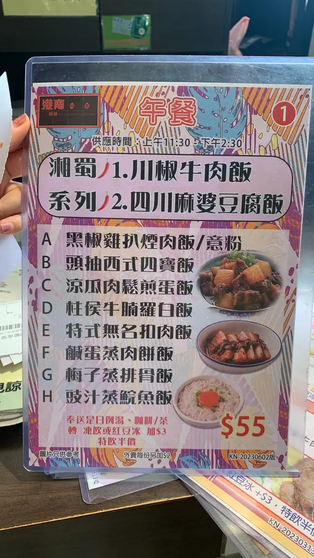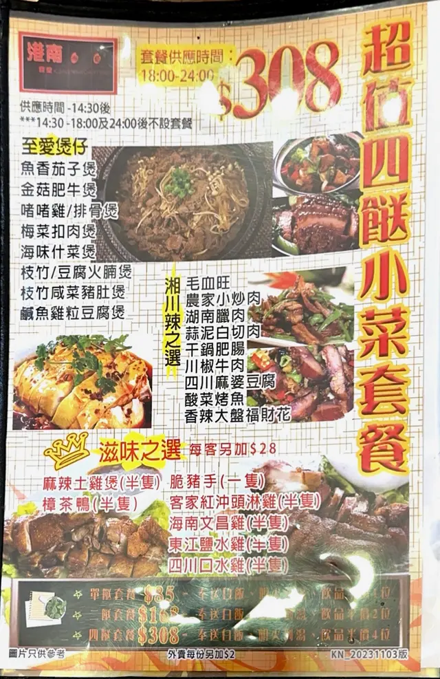 港南湘蜀食堂 (九龍城) 網址: https://s.openrice.com/QrbS0HgK200 地址: 香港九龍城沐翠街晴朗商場地下B19號舖 電話: +852 27662233