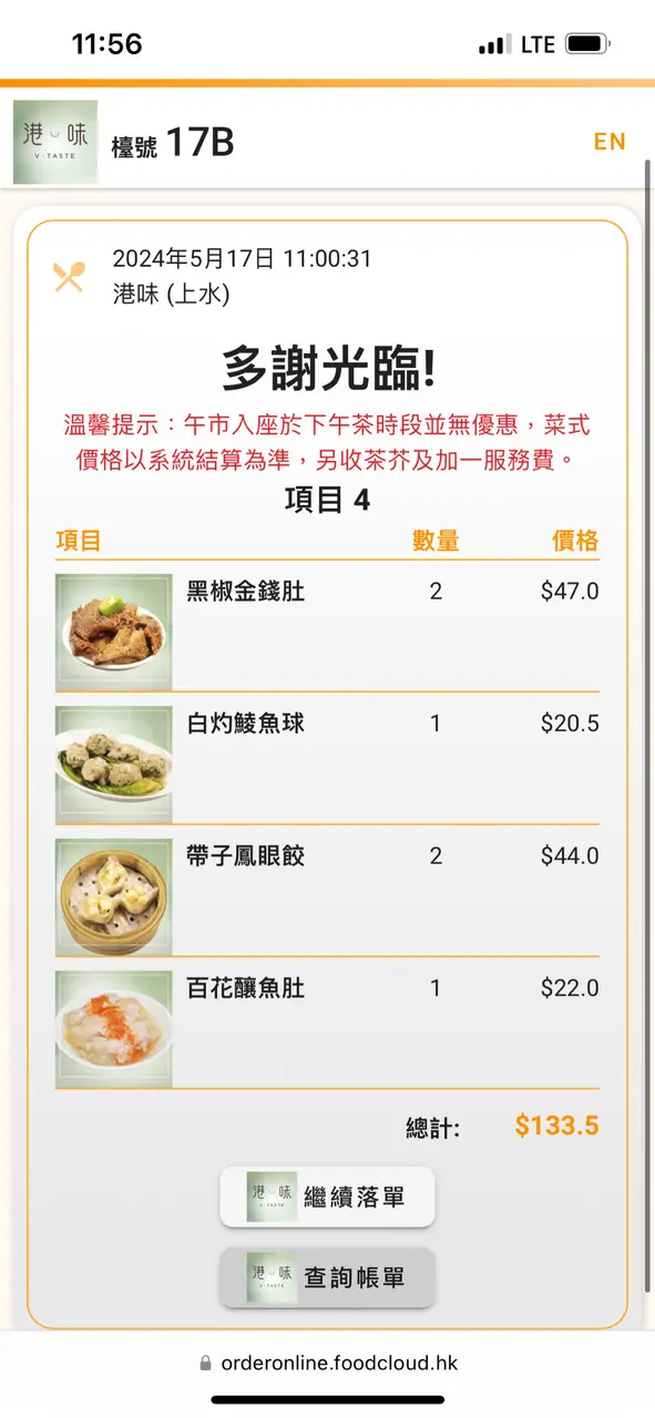 一坐低即刻嗌啲點心,一定食嘅食物先雖然飲早茶嘅時間入座,不過落單嘅時候已經到午市就要跟午市嘅價錢