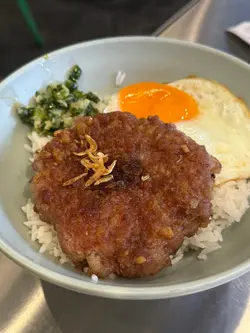 其實咩先至係香港特色食物呢? 適應力、融合、取長捨短等等全部都係?呢度個餐牌睇落相當豐富。 全日早餐、常餐、肉餅、口水鷄、焗飯、煲仔,中西日五湖四海都有,望落去都係吸引既。 可能咁係就係香港精神?煎肉餅幾厚,表面煎到好香。 肉質保持到彈性,咬落好有質感。 加上瑤柱、櫻花蝦,十分惹味。 再加埋流心煎蛋,成件事好豐富。 而飯亦都基本上粒粒分明。 跟餐既翠玉瓜同雲耳,就中和返油膩感。 另外,仲有一杯野,一飲之下竟然係湯。 仲有多少火喉煲過既湯,而唔係隨手一勺既例水,算係少少驚喜。牛骨源湯沙爹牛柳湯麵,湯底真係有少少骨膠感覺。 沙爹牛柳份量足,而且仲係大大片厚切。 黑松露炒蛋亦都幾滑。質素大致上滿意,有機會要試埋焗飯同煲仔。…查看更多