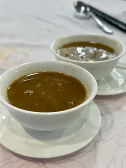 閨密回港我約佢尖沙咀《港晶軒》粵式新派菜有保證,酒樓裝優雅美觀天花水晶吊燈閃亮奪目,環境寬敞座椅舒適。我們點了古法雙冬羊腩煲$388 :酒樓選用東山羊肉肉質軟嫩味香濃不羶,配冬菇、冬筍加枝竹索左湯汁精華,配腐乳醬提升美味,生菜新鮮嫩綠爽脆,配白飯完美組合,秋冬補身必選,食完全身暖笠笠。胡椒花膠雞湯$98(優惠價)雞湯胡椒味香濃,有五件花膠、半隻雞,雞肉美味、娃娃菜清甜,超抵食值得推介。晚飯送糖水:香草陳皮綠豆沙:香草清香,甜度適中。