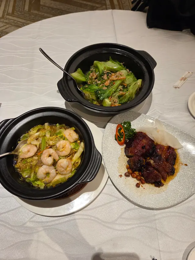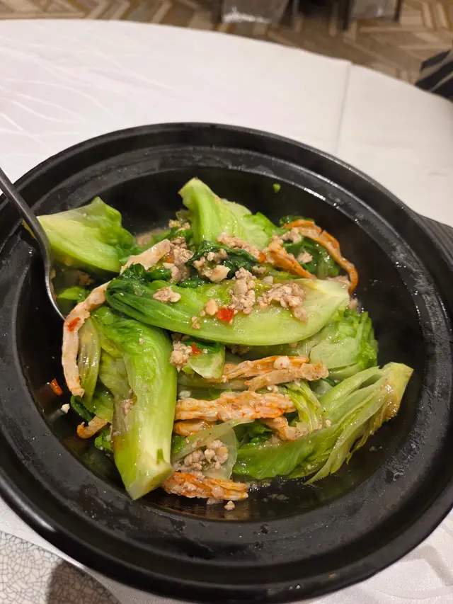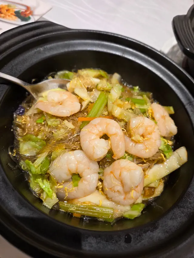粉絲幼身,炒得乾爽香口,鮮香粉味,少有一次過吃到3種不同口味的蝦,每隻蝦同蝦米彈滑爽脆,特别濃香鮮蝦鮮味大澳蝦乾唐生菜煲