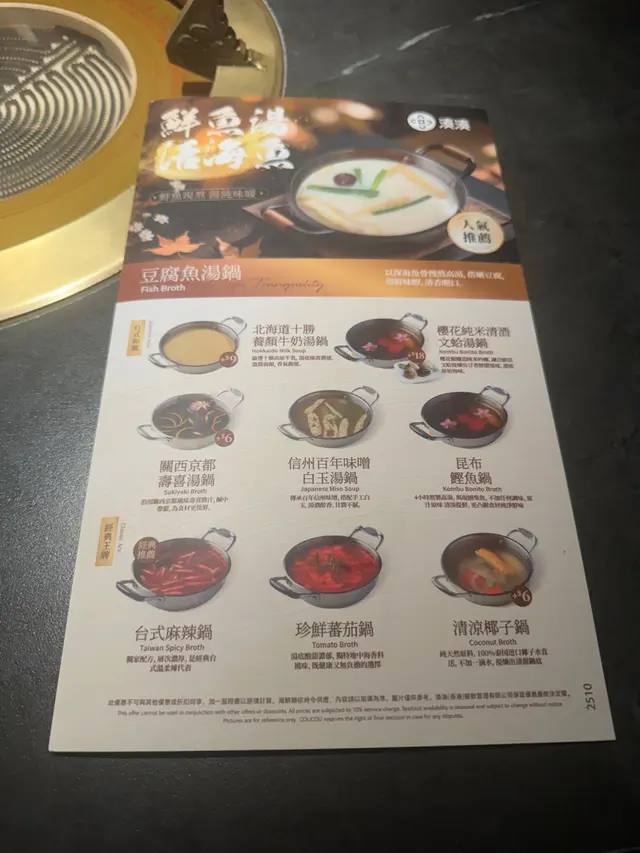 新Menu: 台灣午市定食 BirdieChan等級32025-11-11 關注 大圍圍方的湊湊火鍋,環境雅致舒適,是聚會的好去處。招牌鍋底選擇豐富,台式麻辣鍋香麻不嗆,鴨血豆腐無限續加,非常入味;另一側的番茄牛骨鍋則酸甜濃郁,涮蔬菜一流。火鍋配料品質不俗,牛肉片油花勻稱,海鮮拼盤新鮮,尤其手打蝦滑彈牙鮮美。最後別忘點一杯招牌珍珠奶茶,茶香醇厚,與火鍋意外地搭。服務貼心,整體體驗滿足,值得再訪。…查看更多+ 4以上食評乃用戶個人意見 , 並不代表OpenRice之觀點。讚好分享新Menu: 台灣午市定食 湊湊火鍋‧茶憩 (圍方) https://s.openrice.com/QrbT0XIbV00檢舉 張貼 評分4味道4環境4服務3衛生5抵食推介美食很久沒有來湊湊鍋了,這次轉了新菜單,有時令大閘蟹粉麵,白膳及鳳梨啤酒蝦煲仔菜,但今次我並沒有選擇新的菜單,因為火鍋總是配豬牛肉最適合。整家餐廳最喜歡的就是這個卡位,寧靜的角落,中國式的氣氛。還有用之不盡的火鍋配料,不過可以改善的地方,就是工作人員可以定期清潔。開胃小食,首選是脆辣魚皮,少許辣,開胃醒神。肉質新鮮有梅花,性價比超高,湯底濃郁而不油膩。$128份量十足,野菜拼盤新鮮脆口,烏冬彈牙。用餐途徑堂食