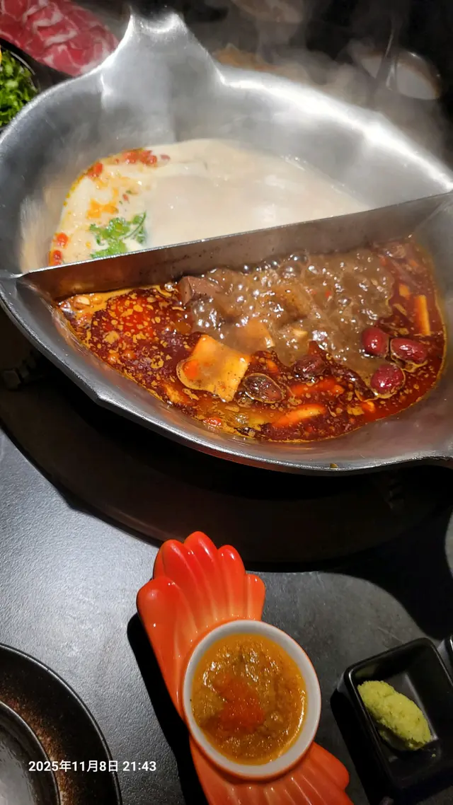 家人聚餐 suetyiu200694等級12025-11-0832 瀏覽 關注 今晚同屋企人嚟食,麻辣湯底又香又麻,辣度好適合香港人口味,另一個金縷醉月煨魚鍋,湯或底鮮甜唔腥,飲得出薑味,正👍🏻👍🏻肉就叫咗牛板鍵同伊比利亞黑豬肉,肉質嫩滑唔‘’鞋‘’,蝦滑都好彈牙。最近又有新鮮象拔蚌,可以熟食又可以做刺身,勁鮮甜😋😋9秘鵝腸同毛肚亦係必點😋小食就梗係唔少得台灣香腸,串串響鈴卷啦😍餐中重有杯冰沙解吓膩,食完重有甜品紅豆豆花送,豆花唔太甜又香又滑,好滿足。直得讚賞嘅係服務員會主動過嚟幫手落蝦滑同剪菜👍🏻👍🏻👍🏻…查看更多以上食評乃用戶個人意見 , 並不代表OpenRice之觀點。讚好分享家人聚餐 湊湊火鍋‧茶憩 (圍方) https://s.openrice.com/QrbT0LnvV00檢舉 張貼 評分5味道5環境5服務5衛生5抵食推介美食象拔蚌麻辣湯,金縷醉月煨魚鍋象拔蚌,牛板鍵,9秒鵝腸,蝦滑用餐日期2025-11-08用餐途徑堂食人均消費$300 (宵夜)