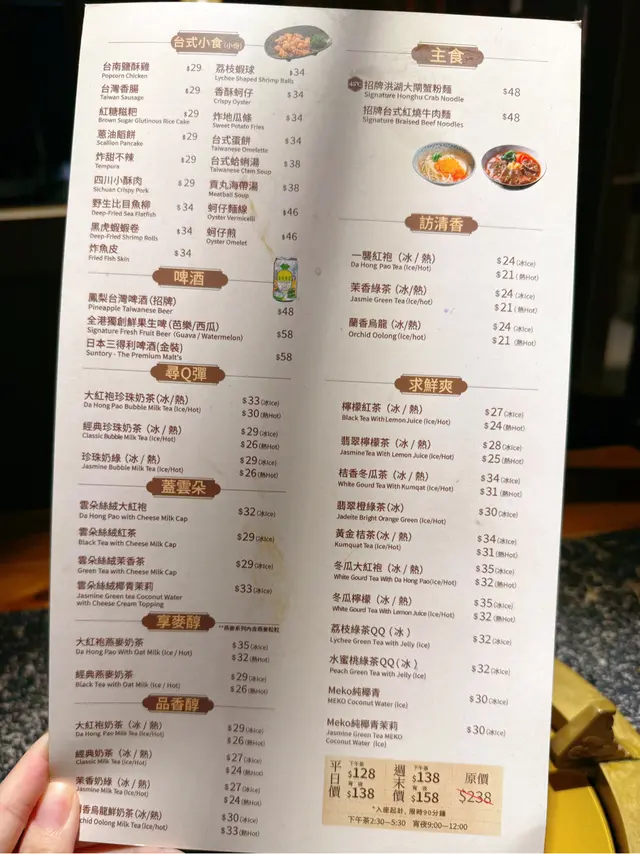 今日放假約左朋友去行街💬💕見到湊湊做緊下午茶任食!我地想揾個地方舒舒服服飲下野傾下計就最啱啦😍*****🇹🇼台式夜市 雙享新味 下午茶自助 無限狂歡 $128 / 位 (平日)🍜主食招牌洪湖大閘蟹粉麵🦀招牌台式紅燒牛肉麵🐮估唔到任食都有蟹粉麵😍啲蟹粉堆得好高!撈埋啲麵食🍝超級香濃!另外牛肉麵係正宗台灣風味都唔錯👍🏻🍖台式小食台灣香腸🌭、炸地瓜條🍟、台式蛋餅🍳、西川小酥肉🥓、荔枝蝦球🍤、黑虎蝦蝦卷🌯、炸魚皮🐟、紅糖糍粑🍬有十幾款嘅台式小食可以任叫任食😍最驚艷嘅係全部都係即叫即整,上菜嘅時候仲熱辣辣架!極度推介炸地瓜條🤩同埋荔枝蝦球😋!我地食完仲encore多次😛🍻啤酒鳳梨台灣啤酒🍍🍵茶米茶大紅袍珍珠奶茶🧋、熱一襲紅袍☕️呢個任食包左超多款式嘅台式手搖,推薦大紅袍珍珠奶茶🧋😍!除左有茶米茶啲手搖之外,仲有啤酒飲🥳我叫左杯台灣菠蘿啤,食住小食飲特別滋味!*****…查看更多