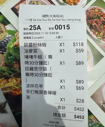 大角咀開左間湖南菜,帶媽媽黎試我鍾意佢既環境,企理乾淨,好多卡位坐,亦有窗邊位望風景前菜叫左個涼拌花甲份量係 勁 多,你當五餅二魚咁每隻殼都有肉,想搵隻空殼都無油麥菜,又係好大碟,夠四個人食呀炒得幾好,蒜香味出,可以改善既點係少返dd油就good手打鴨屎香檸檬茶廿令蚊,又係大杯到夠三個人飲呢杯野好正,唔會甜到傻,食完辣野飲返幾啖,勁解辣呀媽心心念念既啫啫牛蛙煲佢話好少地方有得食,估唔到呢到有而且以佢既經驗,佢話呢個牛蛙煮得好好雖然配料多,有d青椒呀 洋蔥,但牛蛙份量仍然係好多個人人生第一次食,食落少少似田雞,但肉質更軟蒜蓉粉絲蝦呢碟野正,一上枱,想話移下位影下相,隻碟仲係極熱佢d蒜蓉,塞爆,粉絲,塞爆完全誤會哂真係,我地以為係二人份量,原來係四人份量呢個價錢呢個味道真係唔知點輸田雞煲仔飯相對其它呢個飯較為遜色,我嫌d配料切得有d碎,但呢個只係個人口味,可能有人鍾意一口飯入面有好多好多料佢平時d午市客飯好似已經好抵食,下次試試佢!…查看更多