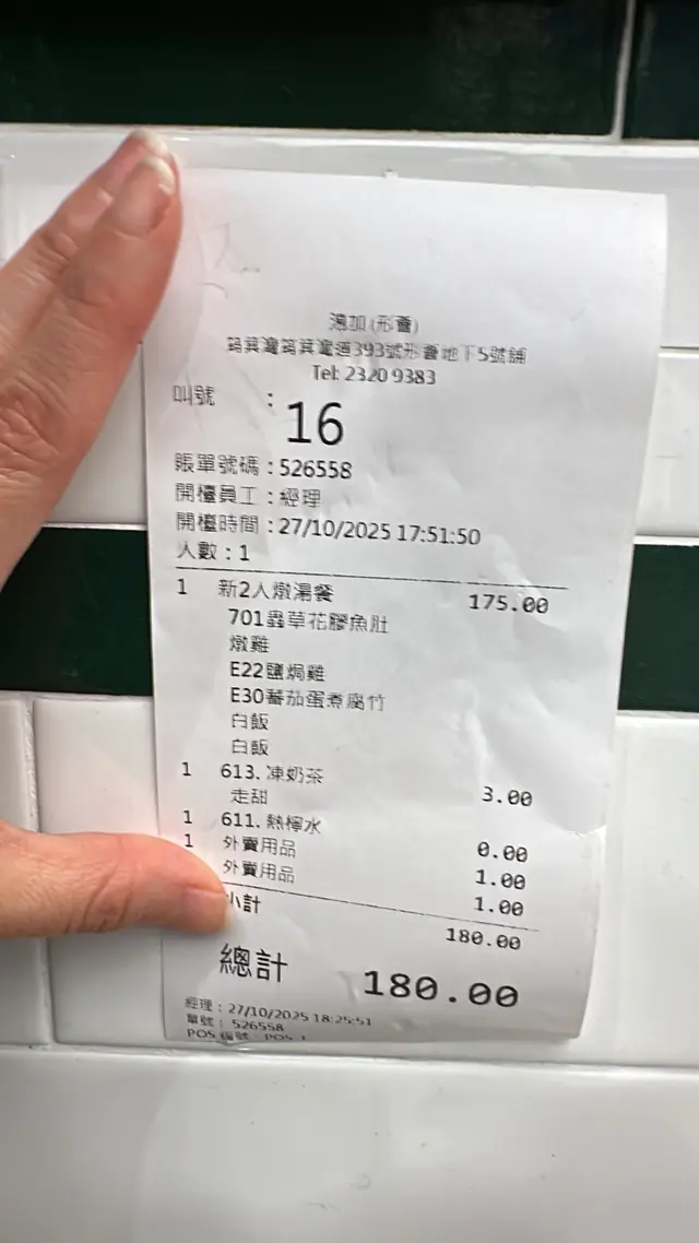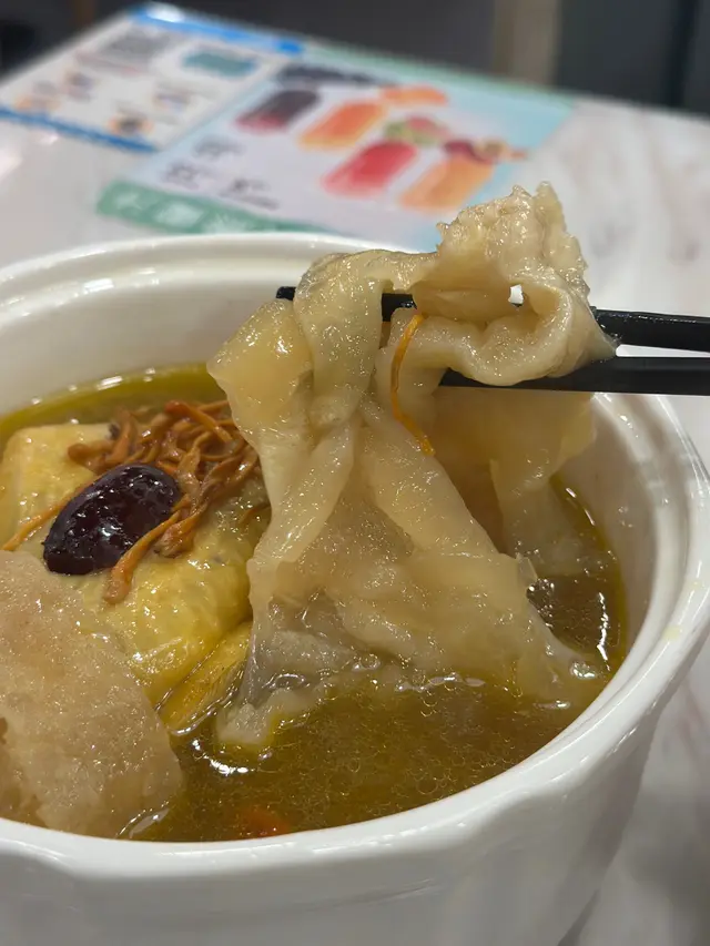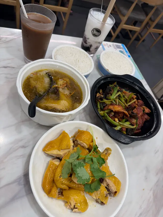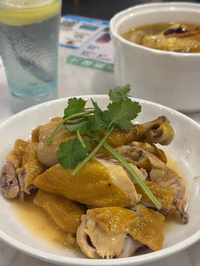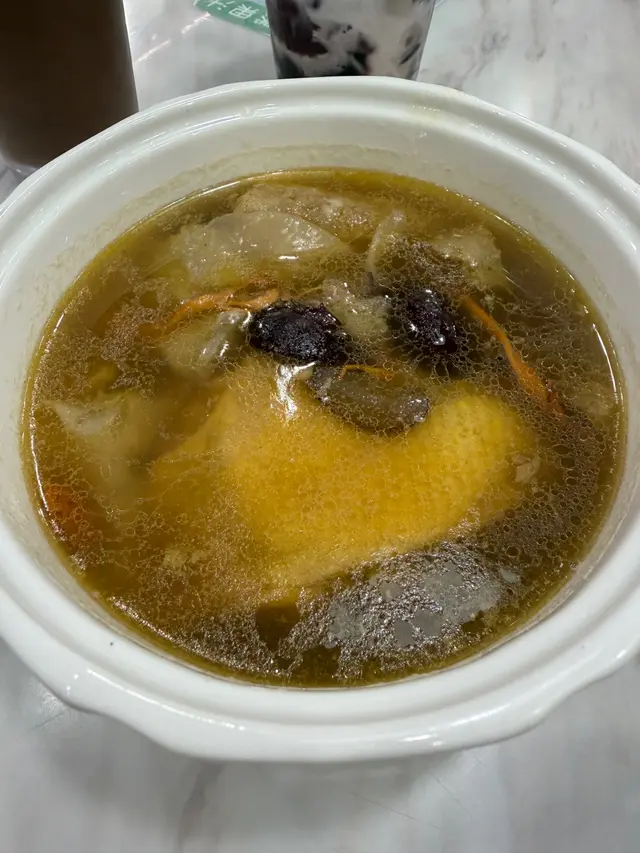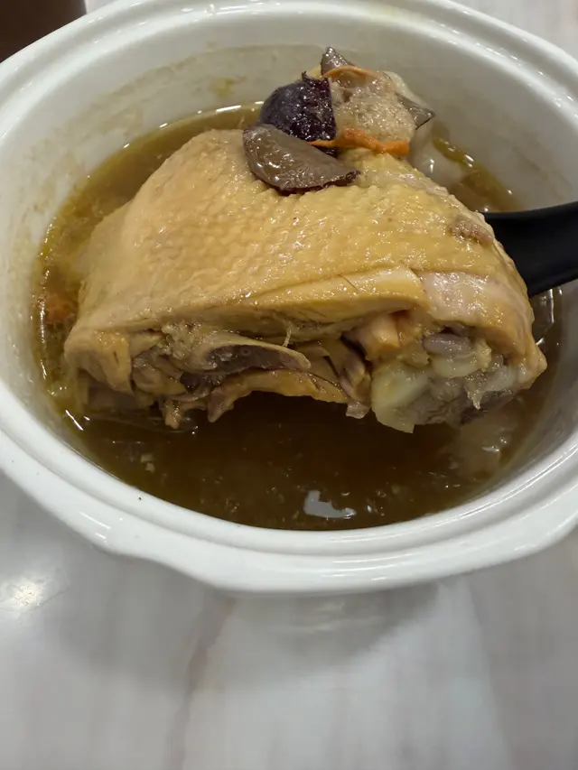 與舊同事相約在筲箕灣某商場吃晚餐小聚,點了二人燉湯套餐,套餐如下:🍲 蟲草花花膠魚肚燉雞湯料實在,花膠與魚肚分量足,煲湯料可以當一個餸來吃。湯頭溫潤。🍗 鹽焗雞(半隻)雞肉咀嚼感十足,雞皮不是太多脂肪,鹽焗香氣夠均衡。🍅 蕃茄蛋煮腐竹家常風味,蕃茄酸甜適中,雞蛋是反蛋,蛋邊煎至金黃色,腐竹吸收湯汁後口感不錯。砵仔飯一人一份,飯粒軟硬適中。環境舒適,適合靜靜聊天,服務態度尚可。若追求家常清淡口味,或可一試;…查看更多