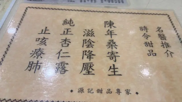 源記甜品專家,一間老字號的糖水鋪,店內售賣的是中國的傳統甜湯,更以杏仁露,合桃露和桑寄生出名.每選糖水亦可以配以蓮子/蛋.再加上上全雞蛋蛋糕.是飯後的良好選擇.