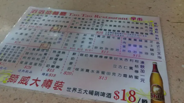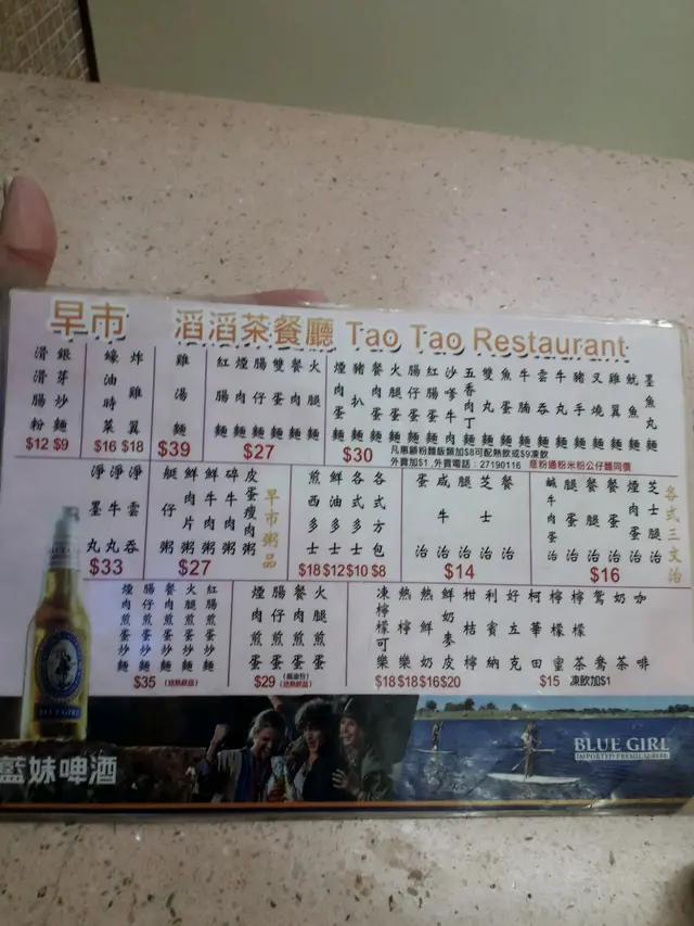 星期天跟認識多年的好友去郊遊, 難得在白沙灣上船, 早小小去到揾間餐廳食晏。白沙灣的餐廳少得可憐, 5隻手指數曬。揀了間經濟實惠的「滔滔茶餐廳」。位於碼頭附近的茶餐廳, 環境衛生不佳, 但是氣氛不錯。這裡沒有自由行, 只有街坊及郊遊人士。菜式同樣非常地道茶餐廳。牛腩湯河$25牛腩牛味欠奉, 牛腩碎濕濕, 味道偏咸。湯頭味道淡而且油淋淋。豉椒班腩炒河味道非常一般, 班腩味道淡味得很。河粉沒有炒到條條分明, 而且油淋。凍奶茶(+$9)用上黑白奶的奶茶, 味道不會太差。茶香奶滑, 有著傳統茶餐廳奶茶的味道。不錯!總結: 食完全身吸了油煙味, 抽風系統要好好改善。食物味道真是非常一般。查看更多