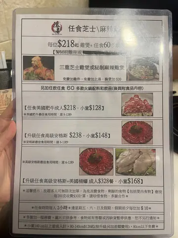 今日係旺角食左間雞煲火鍋都幾唔錯,好平$218起🤭🤭「120分鐘任食雞煲+火鍋」。我地擇左「三重芝士雞煲」仲可以免費加雞件!芝士雞煲!不得了!超creamy 又濃味,芝士控真心要食!舊舊雞都好香芝士味!。我地升級左「任食高級安格斯肥牛 $238」會有埋西班牙黑豚肉、蒙古羊肉卷、澳洲牛舌。幾抵食!同真係即叫即黎!叫幾多黎幾多🤭。。仲有各式丸類、腸類、午餐肉 、自家製鮮蝦雲吞及水餃、菇類同菜類款式選擇多!紅薯粉 稻庭烏冬 出前一丁等等主食食到勁飽。。