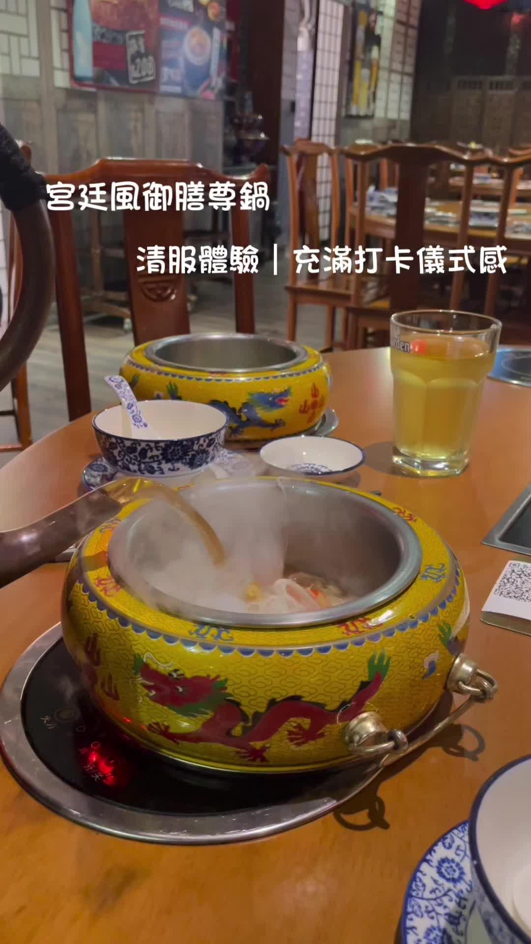 餐廳濃厚的宮廷風格貫穿每個細節,從雕花屏風、紅燈籠到仿古擺設,營造出華麗而有趣的氛圍。特別設有宮廷服飾及龍椅供客人拍照,打卡效果一流,連餐具也精心選用龍紋鍋與鍍金器皿。午市一人鍋設計幾貼心,可以自由選擇心儀湯底,乾淨衛生。餐廳強調每日新鮮熬製湯底及手工製作餃子、丸類,實際體驗亦能感受到真材實料。🥢康熙花膠雞湯底:湯色金黃濃郁,花膠軟滑,雞湯鮮甜不膩,涮食材前先喝一碗十分滿足。🥢順治特色卜卜蜆鍋:蜆量充足,湯底帶蒜香與清酒氣息,海鮮風味突出。試了兩款套餐,整體分量充足,食材配搭見心思:瓏套餐:日本A5黑和牛油花均勻,輕涮數秒入口即化;手打黑松露野菌鮮蝦丸松露香氣足,蝦肉彈牙;紫皇蟹粉豚肉餃蟹味濃郁,值得一試。鼎套餐:伊比利亞橡果豬肉質甘香,手打紫薯流心豬肉丸創意十足,芋泥豬肉餃綿密香甜,日本蟹柳與風琴豆腐吸湯能力強,入味非常。🥢套餐已包飲品,無糖可樂搭配清爽解膩。🌟餐廳以獨特的宮廷主題打造出別具一格的用餐體驗,無論是午市獨自享受一人火鍋,還是與同事共進商業午餐,都可以找到滿足感。…查看更多