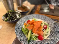 放工後跟同事來到中環的「滿滿食堂」食一個簡單的晚餐🍽️,這是一間主打石燒料理的小店🔥,亦有壽喜燒🍲、定食🍱及特色飲品🥤選擇,菜式精緻又不失份量😉店內裝潢走簡約日系風格🌿,木系傢俱🪵配上柔和燈光💡,牆上掛有手繪風插畫🎨,座位設計寬敞🪑,營造出舒適悠閒的用餐氛圍。而且店員服務親切😊,細心介紹餐點📖,適合三五知己聚餐👫👭或獨自享受一人時光🧍♂️☕。薩摩牛和牛石燒 (150g) $126薩摩牛和牛石燒肉質細嫩🥩,油花分布均勻✨,入口即化😋,和牛石燒後香氣撲鼻👃,既滿足又不膩👍。 套餐附送的白飯🍚/紫菜飯🍙/熊本咖喱飯🍛可免費升級為 蟹皇飯🦀🤩,蟹香濃郁,好惹味❗️套餐+$8 加配一杯 愛玉芒果奶昔🥭味道清甜🍹,愛玉果凍增添口感🍮,冰涼消暑🧊又解膩。壽喜燒牛肉鍋 $72壽喜燒牛肉鍋湯底甜鹹平衡🧂,肥牛片口感嫩滑🥩,吸收湯汁更美味😋,配搭豆腐、芋絲、獅子狗、蔬菜🥬等配料,口感層次豐富,再佐以生雞蛋蘸食🥚,口感更滑順😍 套餐+$8 加配了一杯 鮮果水果茶🍹,味道清新🍋,冰涼解膩🧊。…查看更多