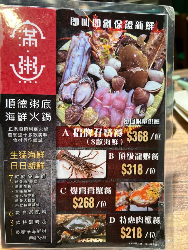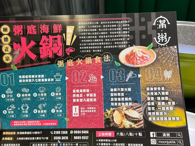 聖誕佳節唔想同人逼,又想食粥底火鍋,約左朋友係附近睇戲,就黎滿粥食粥底火鍋。一坐底,待應叔叔已經上左粥底,滾住先。同埋推介有3個餐可以選擇,一個係半隻肉蟹餐$198一位、另一個係半隻龍蝦餐$298或者兩者兼得-肉蟹同龍蝦各半隻餐 $348,每個餐都夾埋其他時令海鮮,包括鮑魚、蝦、魚片、貝類、蜆同沙白等4個人可以揀唔同既餐,但一定要2個人揀同一款。海鮮送上枱都算新鮮,龍蝦都算幾大隻。枱上面有個計時器,可以根據枱面既指示計住需時幾耐先熟。食完海鮮,侍應姐姐送上一碗粟米、南瓜同芋頭既配料,可以倒入鍋,一陣用黎煮粥。另外可以自選6款配料,唔夠仲可以追加。我地揀左肥牛、雞件、花膠仔、豬腩片、准山同娃娃菜。配料份量足夠4人食,味道正常。食完火鍋,侍應姐姐會帶上粥膽幫手煮粥,配料有冬菜、芫荽、蔥、豬油渣等,如果有人唔食可以另上。有龍蝦既膏煲出黎既粥黃黃地,食落都有一啲海鮮既味道,食埋粥真係幾飽。黃大仙區附近既粥底火鍋好去處,唔夠食可以再追加海鮮同配料,價錢亦都唔算貴,個日接近7點3已經沽清龍蝦,如果好想食龍蝦,建議訂枱時預訂左先,住附近既朋友可以一試。…Read More