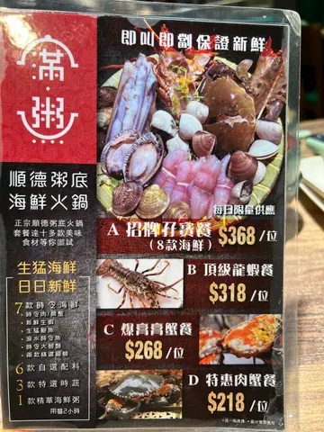 聖誕佳節唔想同人逼,又想食粥底火鍋,約左朋友係附近睇戲,就黎滿粥食粥底火鍋。一坐底,待應叔叔已經上左粥底,滾住先。同埋推介有3個餐可以選擇,一個係半隻肉蟹餐$198一位、另一個係半隻龍蝦餐$298或者兩者兼得-肉蟹同龍蝦各半隻餐 $348,每個餐都夾埋其他時令海鮮,包括鮑魚、蝦、魚片、貝類、蜆同沙白等4個人可以揀唔同既餐,但一定要2個人揀同一款。海鮮送上枱都算新鮮,龍蝦都算幾大隻。枱上面有個計時器,可以根據枱面既指示計住需時幾耐先熟。食完海鮮,侍應姐姐送上一碗粟米、南瓜同芋頭既配料,可以倒入鍋,一陣用黎煮粥。另外可以自選6款配料,唔夠仲可以追加。我地揀左肥牛、雞件、花膠仔、豬腩片、准山同娃娃菜。配料份量足夠4人食,味道正常。食完火鍋,侍應姐姐會帶上粥膽幫手煮粥,配料有冬菜、芫荽、蔥、豬油渣等,如果有人唔食可以另上。有龍蝦既膏煲出黎既粥黃黃地,食落都有一啲海鮮既味道,食埋粥真係幾飽。黃大仙區附近既粥底火鍋好去處,唔夠食可以再追加海鮮同配料,價錢亦都唔算貴,個日接近7點3已經沽清龍蝦,如果好想食龍蝦,建議訂枱時預訂左先,住附近既朋友可以一試。…查看更多