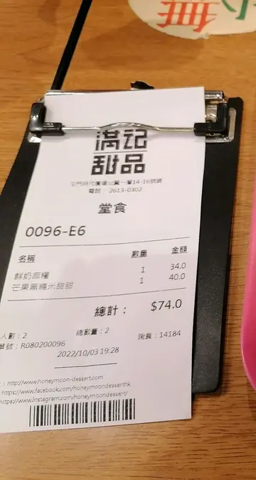 ,終於前幾天去了滿記甜品一試究竟。店內的坐位相隔十分寬,環境也算十分整潔,可是不知為什麽部份座位被封了,不準使用,幸好店內人流不多,環境不太嚐嘈雜,所以用餐環境不錯。但是店內的員工有部份正在店內用膳,所以未有人帶位,結果是我自己找位置坐。我和老婆叫了鮮奶麻糬和芒果黑糯米甜甜。在下單10分鐘後,我們的甜品便到了