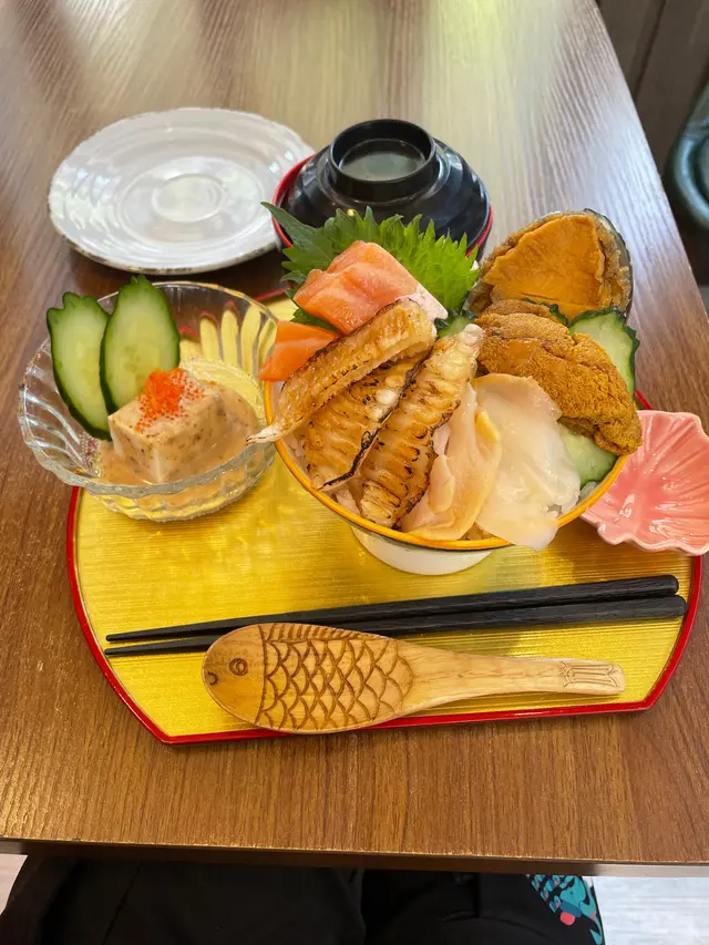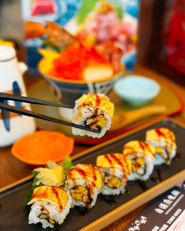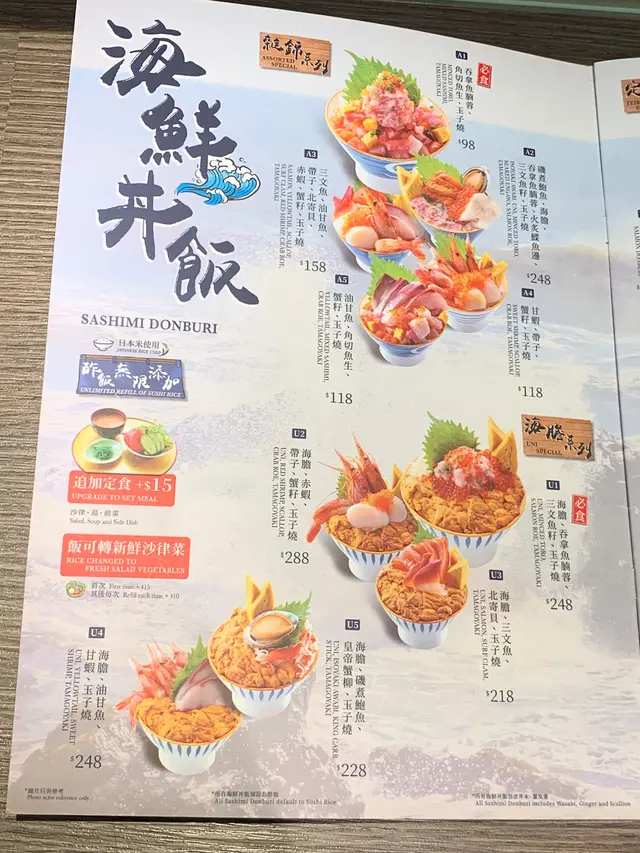 三文魚、油甘魚、帶子、北寄貝、赤蝦、蟹籽、玉子燒丼飯