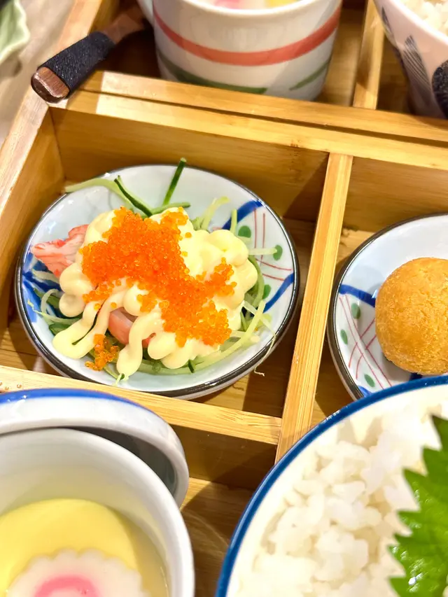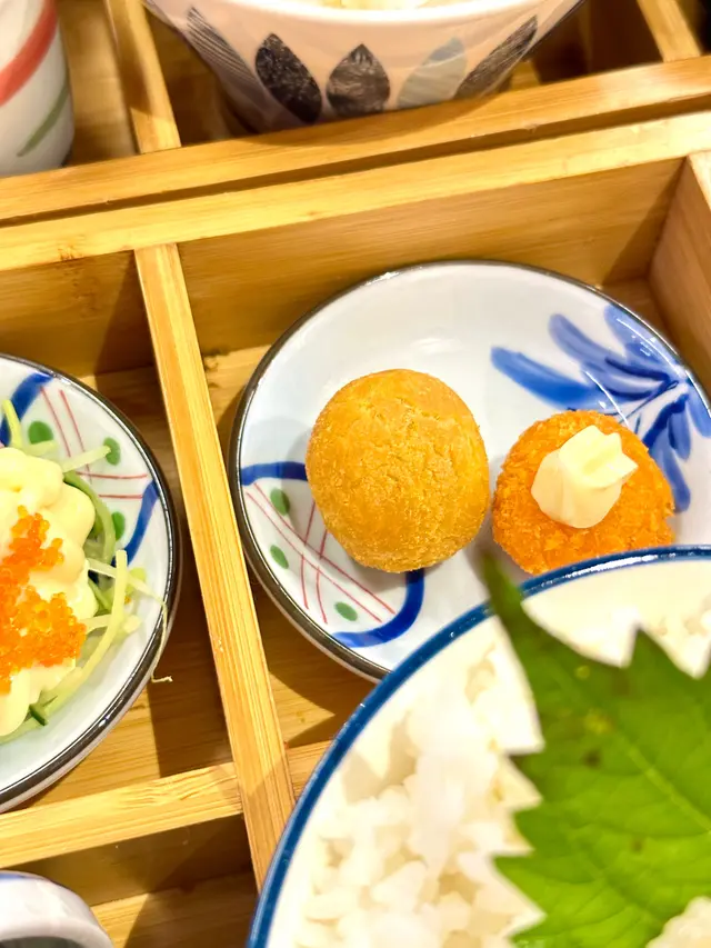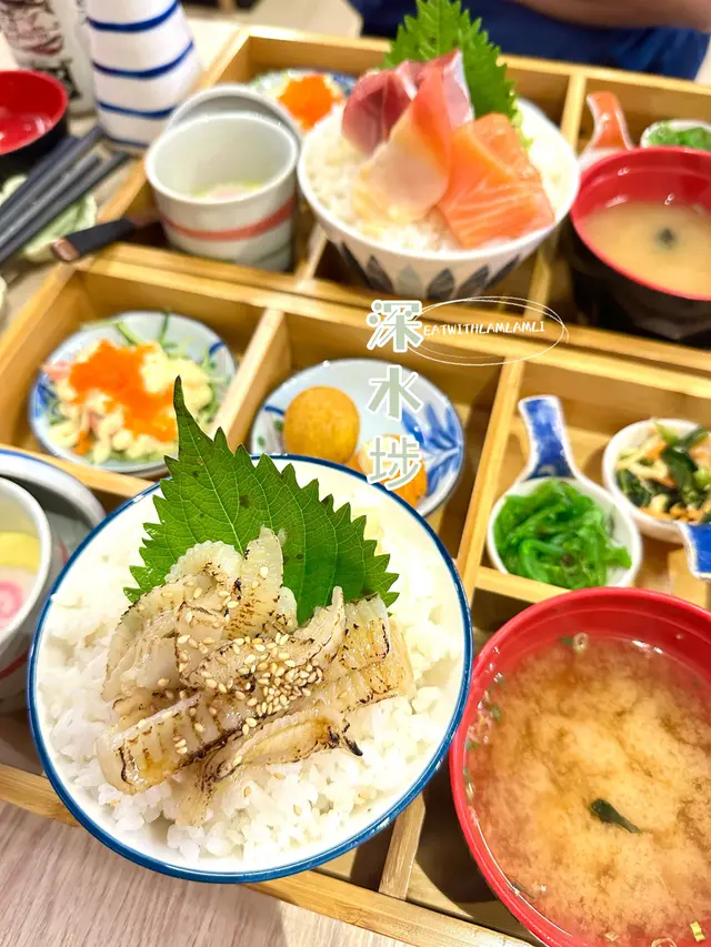 午市定食除了主食 更有前菜蟹籽沙律 中華沙律 小食有炸芋圓及炸帶子丸 熱食有茶碗蒸及麵豉湯整個以九宮格形式呈上 非常日系感 令人食指大動😋🍽️火灸鰈魚邊定食 $78火灸鰈魚邊入口即溶 魚油佈滿口內 而鰈魚是放在飯上火灸 所以魚油同時都溶在飯上 令飯添了魚油香 非常好吃😋🍽️三色刺身定食 $98刺身新鮮 性價比高 惟三文魚及油甘魚有筋 若提供腩位會更加可取查看更多
