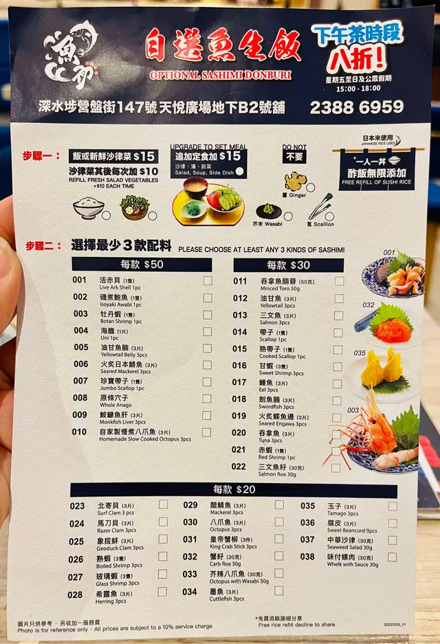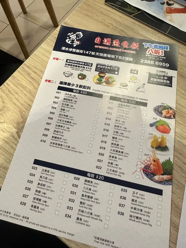 位於長沙灣營盤街天悅廣場地舖嘅「漁初·魚丼 」,食物有質素,而且選擇頗多。時令刺生、生蠔、壽司、手卷、串燒、小食、烏冬及冷/熱飯丼,都有供應。特別要試《自選魚生飯》,先選酢飯或沙律,然自選三款或以上魚生配料,想點配搭自己話曬事。另外仲可追加升級為定食,加配沙律、湯及前菜,只需$15。配料多達近40款,每款由$20、$30及至$50不等。:)我比較貪心,選了油甘魚腩、劍魚腩、赤貝一隻,海膽、赤海蝦和芥末八爪魚,尤其喜愛油甘魚腩及劍魚腩,魚腩肥美油脂甘香。此外,餐廳採用日本產米,酢飯特別有咬口及有飯香,客人更可以無限添加酢飯,包你食到飽飽,當然基本要一人一丼才可無限添加啦。吾想自選,亦可選擇特定魚生飯丼,亦有二十多款供選擇。價錢由$88至$288 不等,同樣可升級為定食。串燒亦都有驚喜,包括有肉類、海鮮類及蔬菜類,共有四十多款。雞、牛、羊、豬一應俱全。燒蠔、蟶子、大蝦等都有,非常全面。選了必食牛舌心、雞皮、雞軟骨及蒜心。個人尤其喜歡燒牛舌心,入口爽彈有牛甘香味。蒜心較少見所以試下,頗清甜冇根不錯。整體餐廳環境、食物都很不錯,其他例如北海道真蠔、鹿兒島和牛刺生等都好吸引,可以約埋朋友一齊再試。值得推介的一間日式餐廳。下午茶時段(3-6pm)更有八折優惠。限定優惠生啤原價$68,特價$48,亦有清酒供應。小店座位不太多,建議提早預訂留座。查看更多