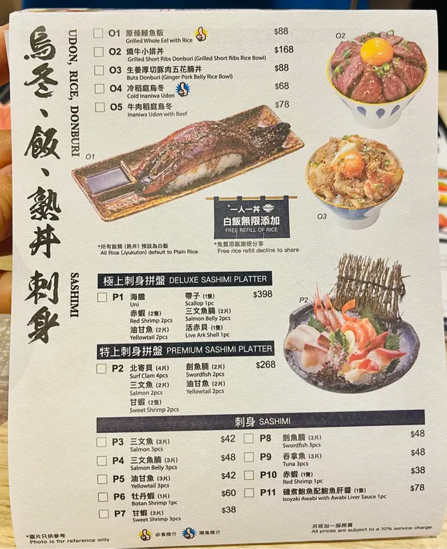 喺長沙灣睇完戲就試一試呢間野。我同老婆叫左個三文魚帶油甘魚丼飯,兩串肥牛蘆筍,一串雞皮,兩皮明太子雞髀肉同埋兩串雞翼。仲有兩杯生啤。個丼飯,好一般,三文魚比左六塊,但好普通無乜味道,油甘魚又喺無乜味,喺得帶子有小小帶子味道。同埋好細碗。 雖然可以追加飯但都無魚生送飯,所以作用不大。 兩杯生啤都算細杯,如果大杯d,性價比會好好多。成晚嘅串燒除左肥牛蘆筍燒得好食,其他唔掂。雞翼乾到乜咁,明太子雞脾肉喺雞肉串,唔喺一舊舊嘅雞肉。雞皮好脆但,好細塊,一咬完就無了。最後埋單要640。 嗯..性價比好唔夠。另外舖頭無洗手間,要去隔離廣場,好唔方便。唔會有下次。查看更多